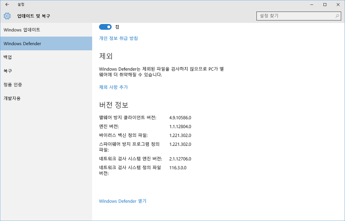 Windows Defender > 제외 아래의 '제외 사항 추가' 클릭