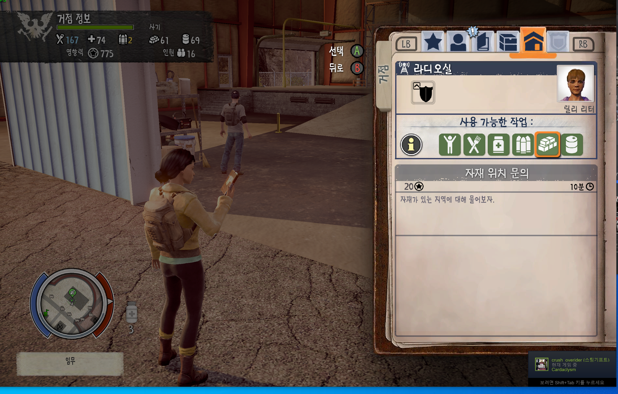그리고 스토리 상 미션이나 다른 생존자 그룹의 미션을 할 경우, 따라오긴 하지만 미션이 시작되면 돌아가버리므로 영향력을 낭비하는 일은 없도록 하자. 안하면 안한다고 말을 하라고!