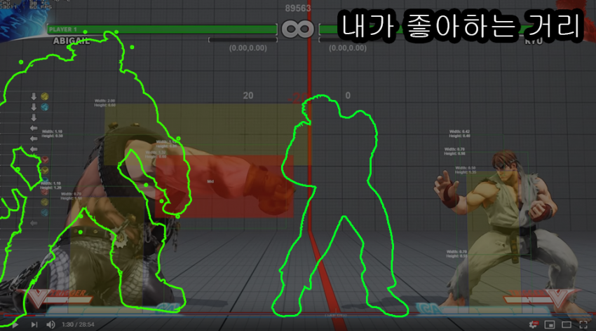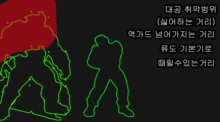 반대로 이 거리는 아까 대공영역도 충분히 카바되고 특히 상대의 점프에 대응해 서서약손을 늦게 내밀어도 커트할수 있는 경우가 많아.