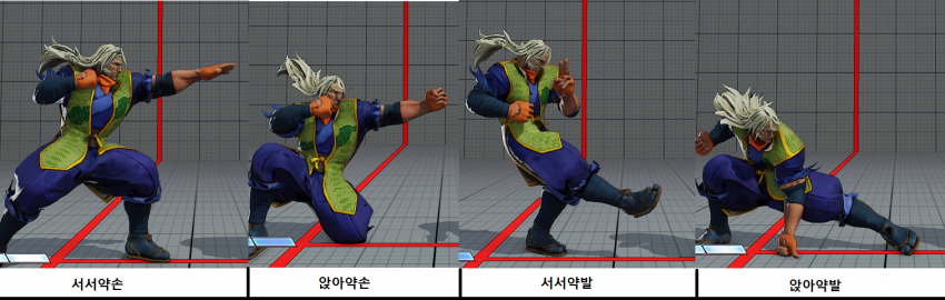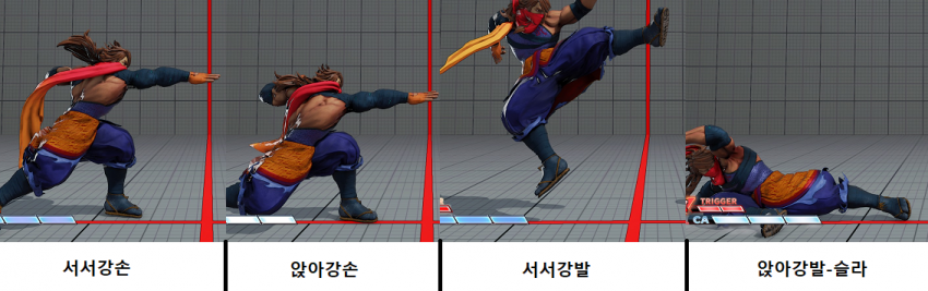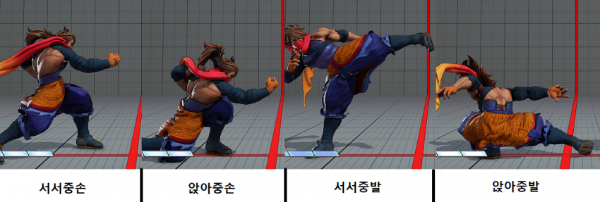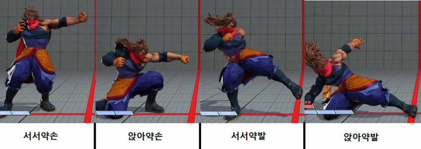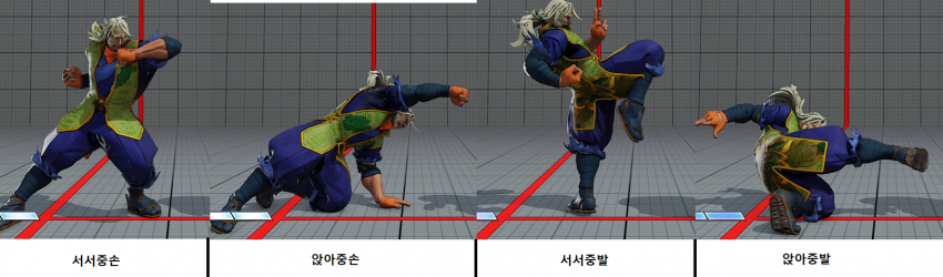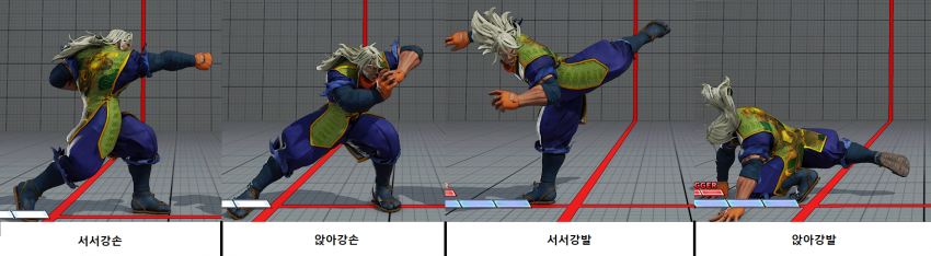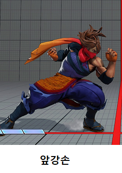 앉아강손은 지속4프레임이라 전후방 모두 잡을 수 있는 기본기지만 후방낙법을 잡는 마지막 지속프레임에서는 캔슬이 안된다는 단점이 있음