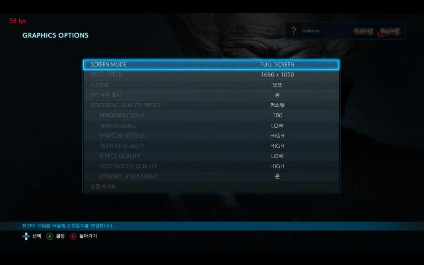 다른 설정들은 살펴봤는데 자동이거나 게임의 설정에 따른다가 기본으로 설정되어 있어서