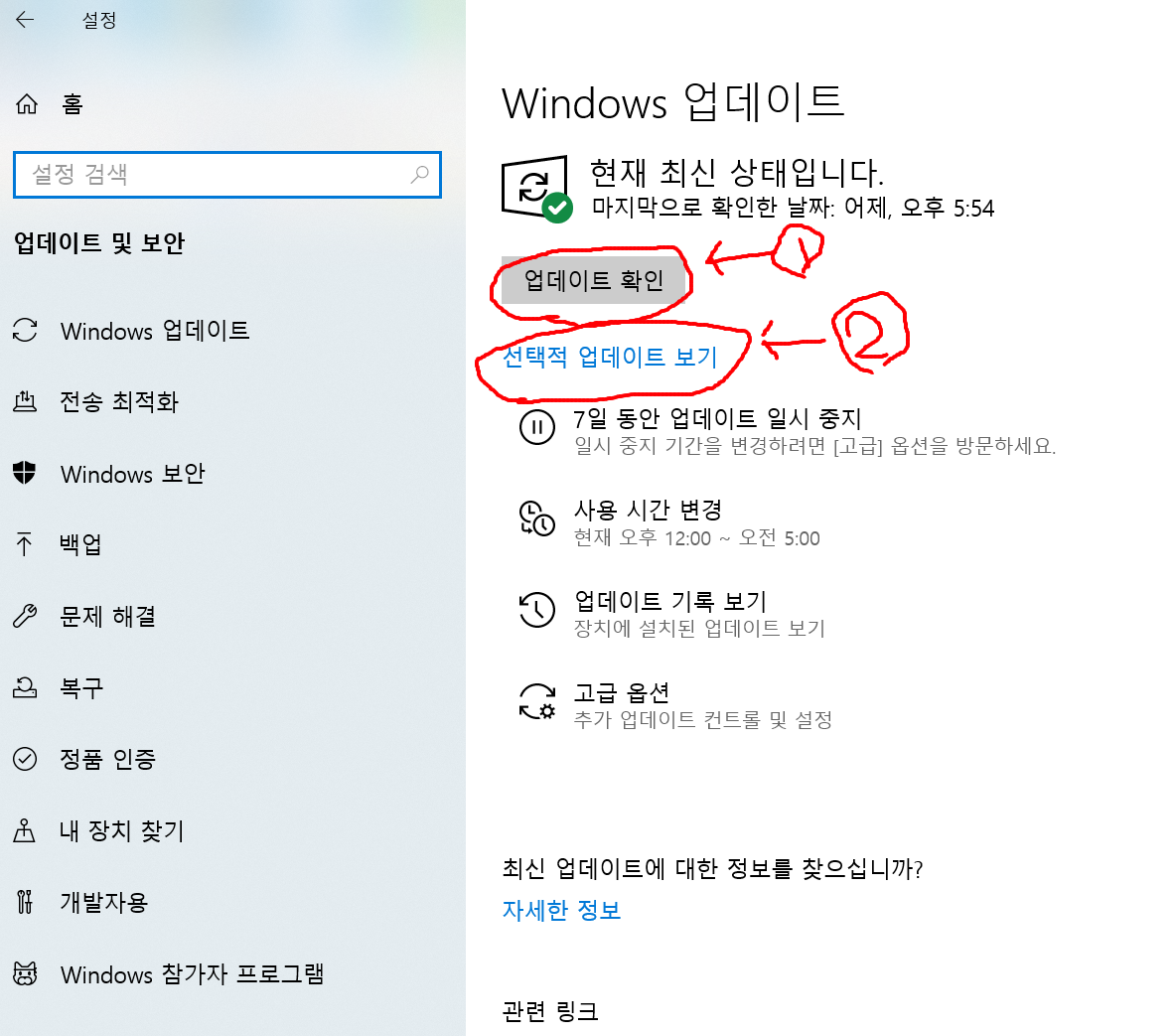 그렇게 안된다면 "그림표시2"와 같이 "선택적 업데이트 보기"를 눌러준다.