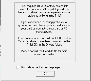 I have tried using ver 1.5.11 but when I try to start the game with my own patched thief.exe, the game doesn't start at all (my cursor changes briefly to the "waiting" appearance and then goes back to normal). If I try to use the patched exe for Thief Gold from the ddfix thread, it keeps prompting me to insert disk 2 into the CD drive (this happens whther the disk is in the drive or not).