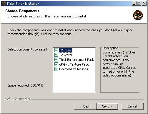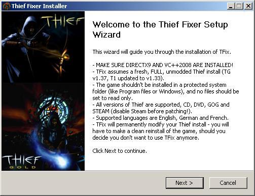 -if you have the STEAM version, you NEED TO SHUT DOWN STEAM BEFORE PATCHING. having steam running in the background during the patching process may block out some essential files, and break the patch completely. -requires VC++2008 and the latest directx9 redistributable from june 2010 (download the package, run it, extract to a temp folder, open the folder, and run dxsetup.exe, all needed updates will be performed automatically). most pcs should have them already installed, but there is no harm in reinstalling to make sure. -if you have the original CD release, and the game installer is not working, you can do a manual install - just copy the THIEF folder from both CDs to your hard drive (overwrite the folder from the first cd with the one from the second, that should make sure all the resources end up in just one folder), run TFix, and follow the instructions. -do not set any compatibility modes on the exe, this will break the game. -installing the game to a protected folder (windows, program files etc) may result in strange and broken behaviour (vista/win7). -should you decide to try out some other combination of mods, just run the installer again and repick any desired combination. -if you have issues with slow walk and run speeds, try using the "classic" set of controls, load them through the options/customize controls/load menu. -when your movies still fail to load even after a reboot, try using the static linked lgvid dll from here (mirror google drive) - drop it into your Thief folder.