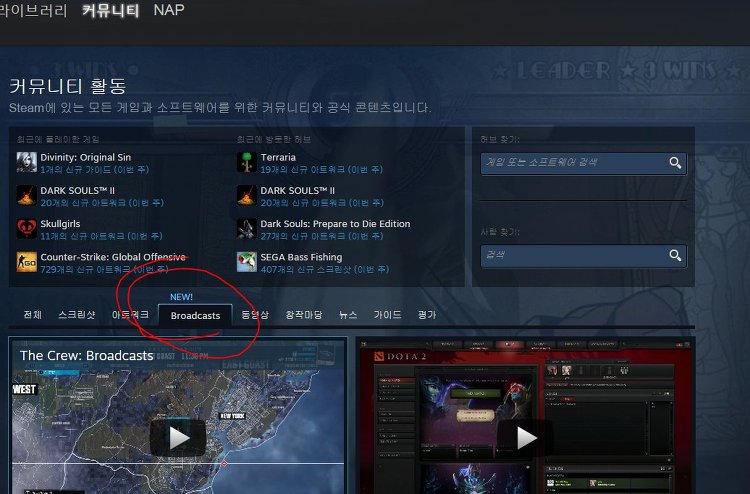 커뮤니티 페이지에 브로드캐스트 항목이 새로 생겼고