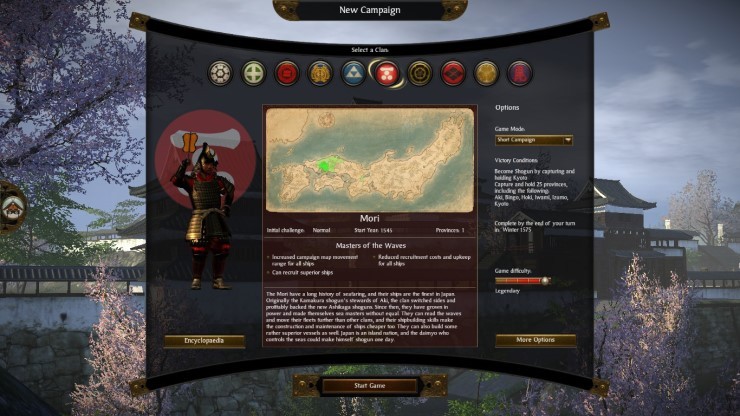 모리 가문의 별명: 난 해적왕이 될꺼야! 능력이 별 도움되지 않는 가문 특성: 뛰어난 함선 생산 비용 및 유지비 감소, 함선 이동거리 증가 특수병종: 왜구 약탈병(군항과 검도장이 필요하여 바로 생산이 불가능하지만, 왜구 약탈병이 저렴하고 1턴 생산이 되기에 모이면 답이 없습니다. 여기에다 방탄면 더더욱 답이 없습니다.) 별명의 이유: 원래 왜구 약탈병은 기존에 없었지만, 새로운 유닛팩 DLC가 나오면서 추가된 병종이고 이 병종의 위험성 때문에 모리가 쉽게 멸망하지 않습니다. (그렇지만 해적이라는 것이 흠입니다.) 그런데 가문 특성은 가문의 성장하는데 크게 도움되지 않습니다. (도움이 된다면 통로 차단 및 무역항 획득)