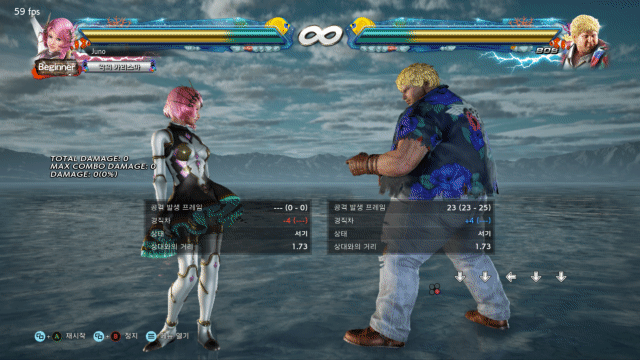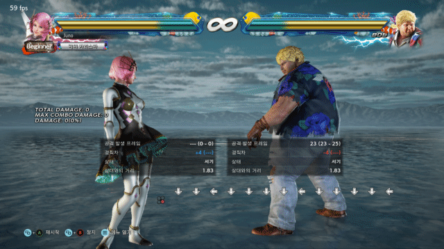 주먹 두 번 이후 옆돌기를 합니다. 태그 2까지는 3타나오기 이전에 잽을 맞으면 공중에서 건져졌는데 fr에서는 동시히트 하는 경우만 확인했습니다. 3타가 맞으면 2lp 기와가 확정이니 때려주세요.