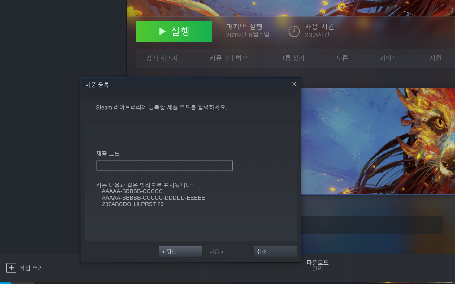 여기에 자기가 구입하거나 누군가에게 받은 스팀키를 입력해주고 "다음>" 을 눌러주면 정상적인 스팀키라면