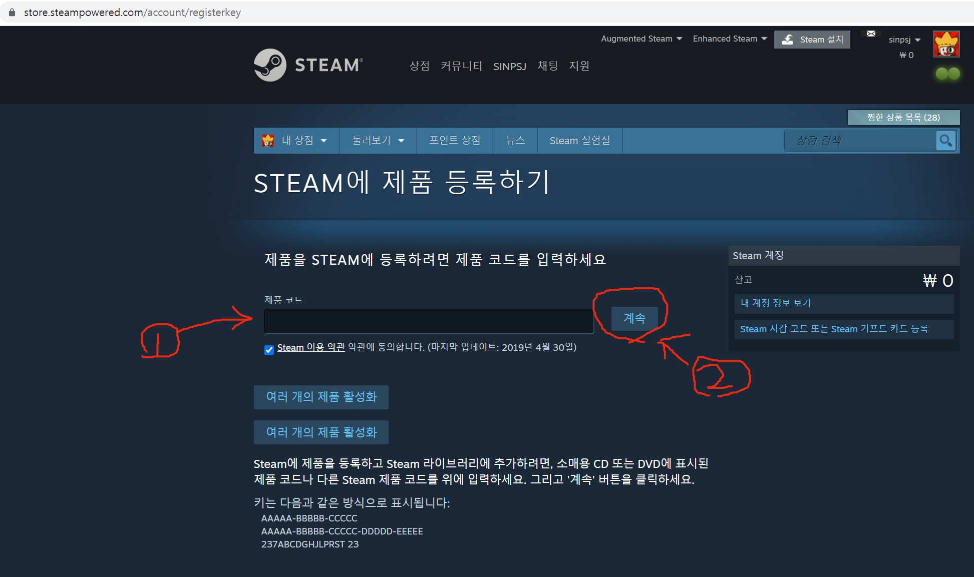 설명2) 위에"설명1)"에서 진행 하다보면 "다음", "동의" 를 눌러보면 다음과같이 스팀키 입력란이 나올것이다