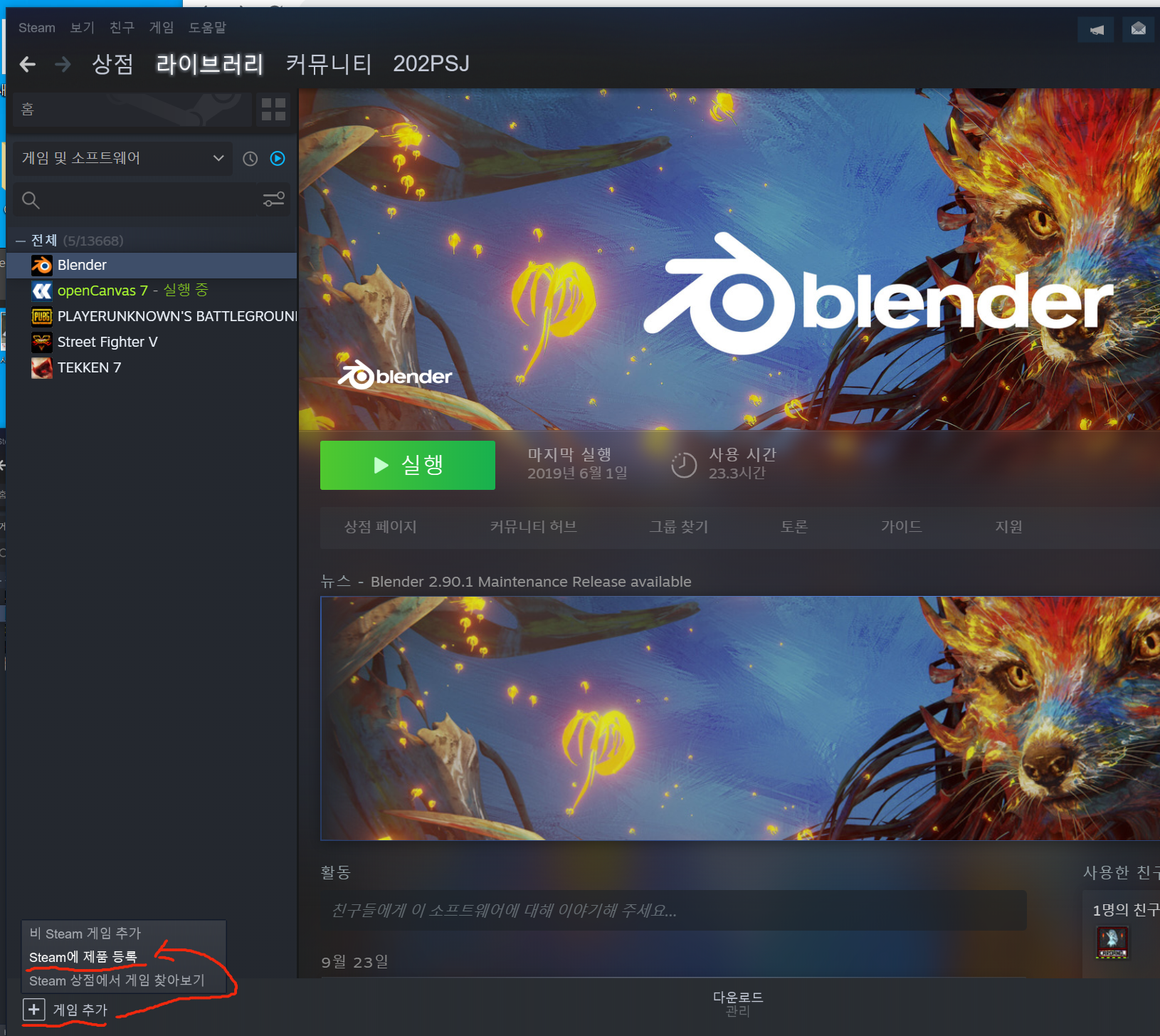 빨간줄을 보면 "게임추가"를 누루면 팝업창이 뜨는데 거기에서 "Steam에 제품등록" 을 눌러준다