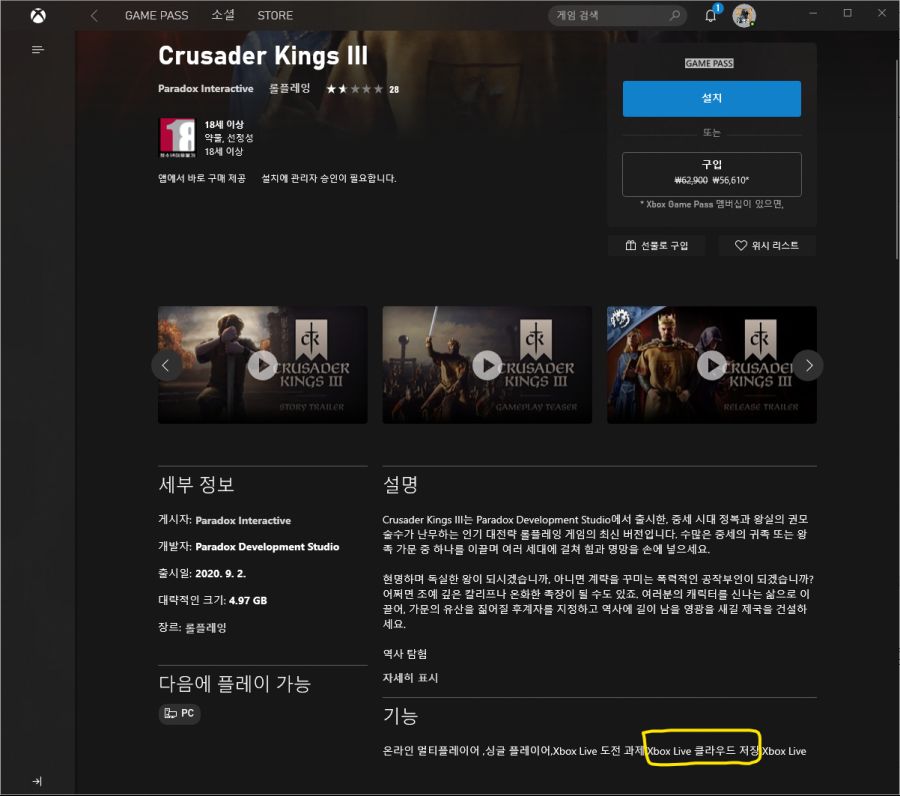 반대의 케이스로 위 스크린샷을 보시면 기능란에 Xbox Live 클라우드 저장이라는 항목이 보이지 않습니다.