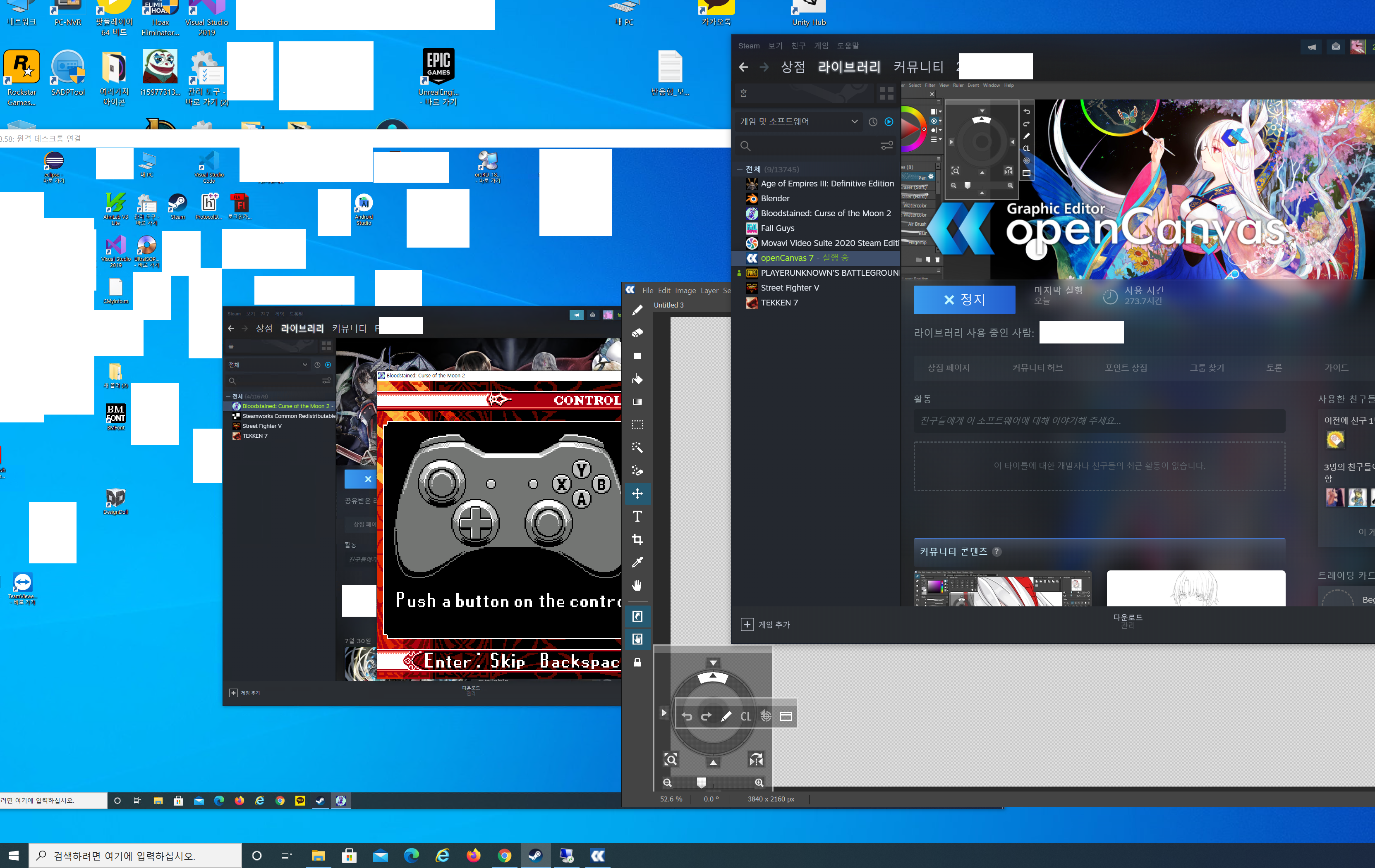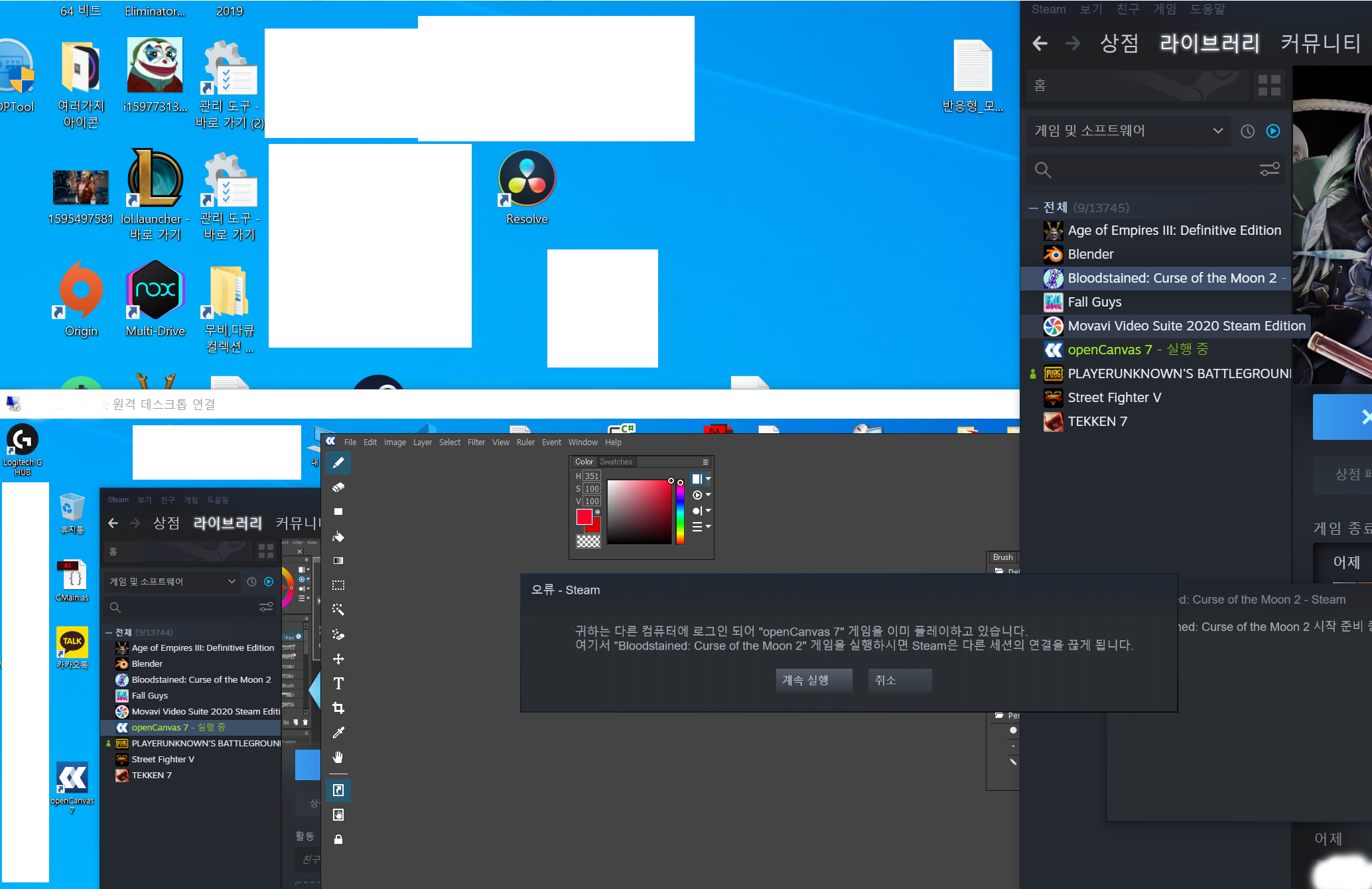 그림에서 보면 원격으로 한계정을 2개의 PC에 로그인하고 하나는 게임, 하나는 도구(오픈캔버스)를 실행했지만