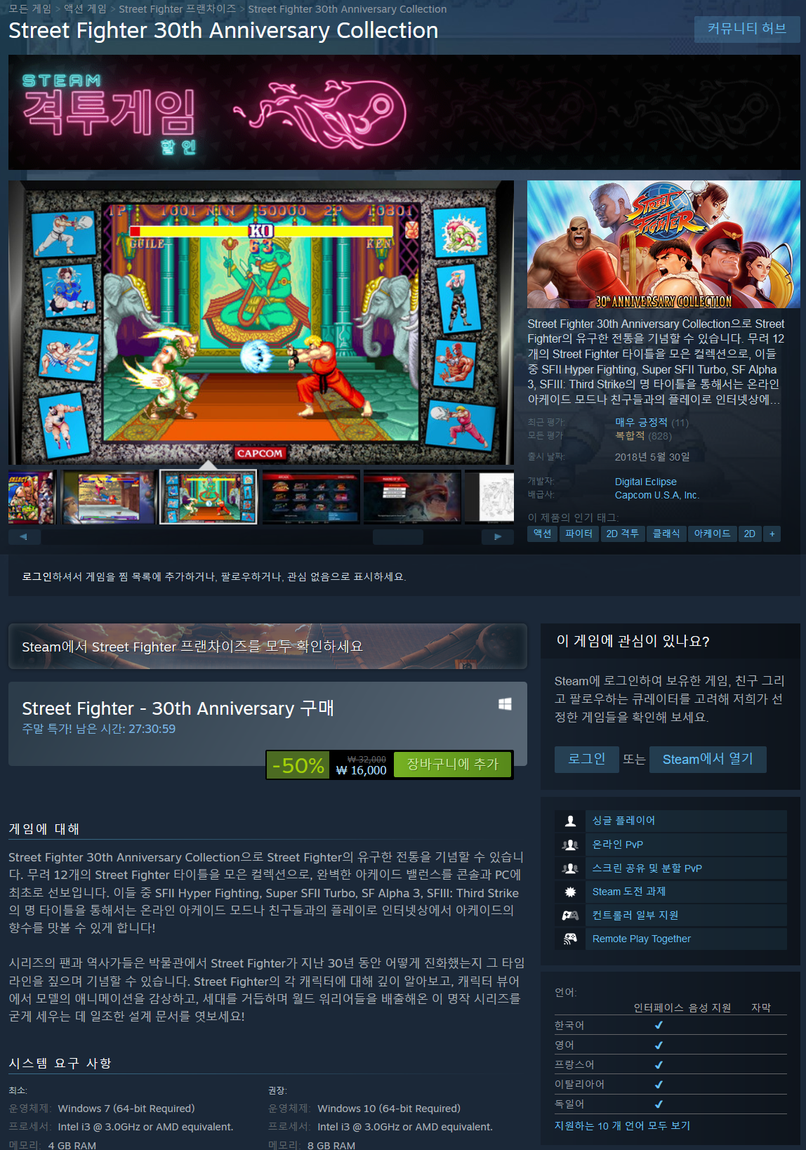 Street Fighter 30th Anniversary Collection으로 Street Fighter의 유구한 전통을 기념할 수 있습니다. 무려 12개의 Street Fighter 타이틀을 모은 컬렉션으로, 완벽한 아케이드 밸런스를 콘솔과 PC에 최초로 선보입니다. 이들 중 SFII Hyper Fighting, Super SFII Turbo, SF Alpha 3, SFIII: Third Strike의 명 타이틀을 통해서는 온라인 아케이드 모드나 친구들과의 플레이로 인터넷상에서 아케이드의 향수를 맛볼 수 있게 합니다!