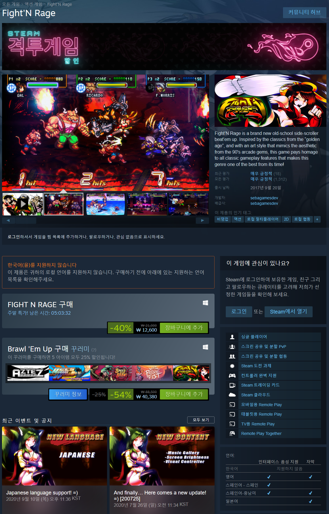 제가 90년대 초중반 오락실을 집처럼 들락날락거리던 세대라 그런지 비뎀업/벨트스크롤 액션게임 장르를 특히나 좋아하는데 이 "Fight'N Rage"는 정말 오랜만에 보는, 그래서 더욱 반가운 액션 게임입니다.