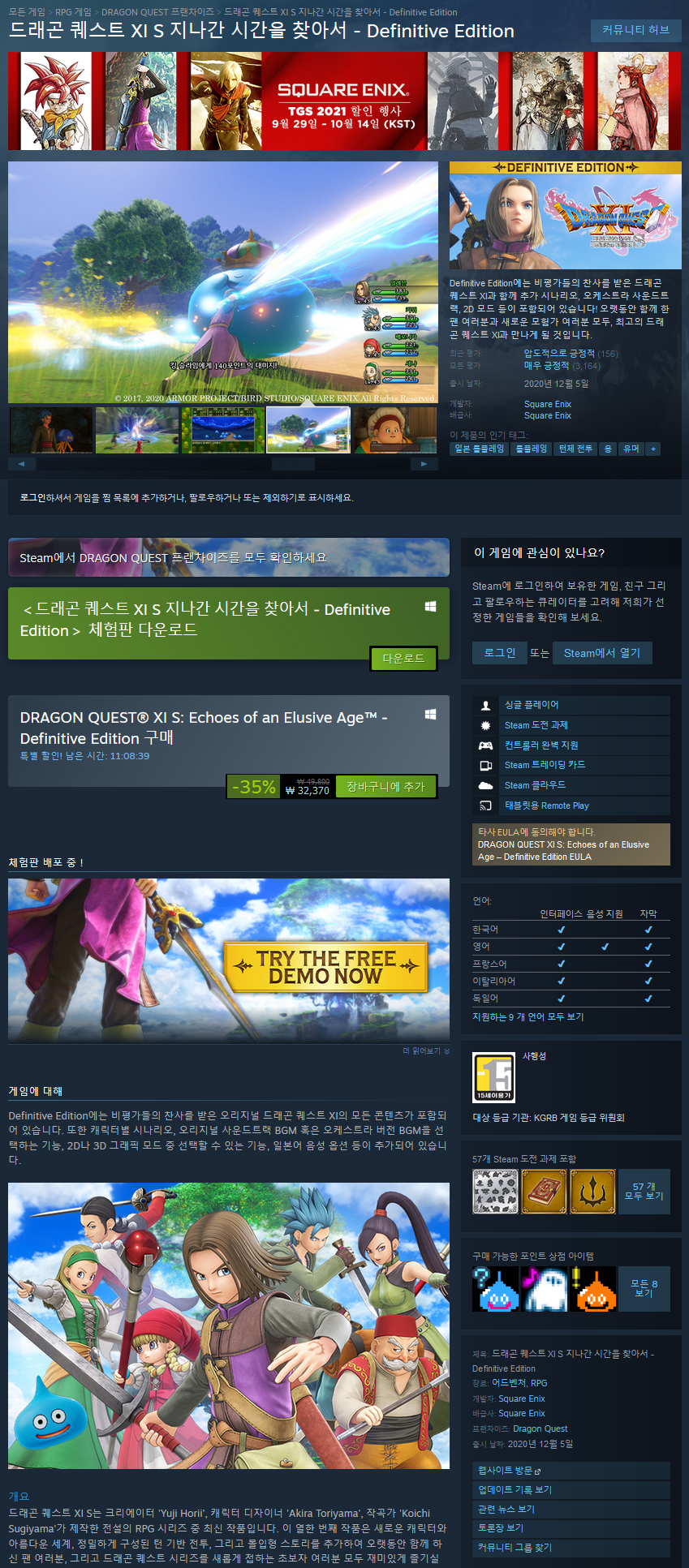 드래곤 퀘스트 XI S는 크리에이터 'Yuji Horii', 캐릭터 디자이너 'Akira Toriyama', 작곡가 'Koichi Sugiyama'가 제작한 전설의 RPG 시리즈 중 최신 작품입니다. 이 열한 번째 작품은 새로운 캐릭터와 아름다운 세계, 정밀하게 구성된 턴 기반 전투, 그리고 몰입형 스토리를 추가하여 오랫동안 함께 하신 팬 여러분, 그리고 드래곤 퀘스트 시리즈를 새롭게 접하는 초보자 여러분 모두 재미있게 즐기실 수 있도록 만들어졌습니다. 드래곤 퀘스트 XI은 일본에서 출시된 이후 PlayStation의 Platinum Prize를 수상하고 패미통(일본의 영향력 높은 비디오 게임 간행물)에서 40점 만점에 40점을 받는 등 여러 게임상과 극찬을 받았습니다.
