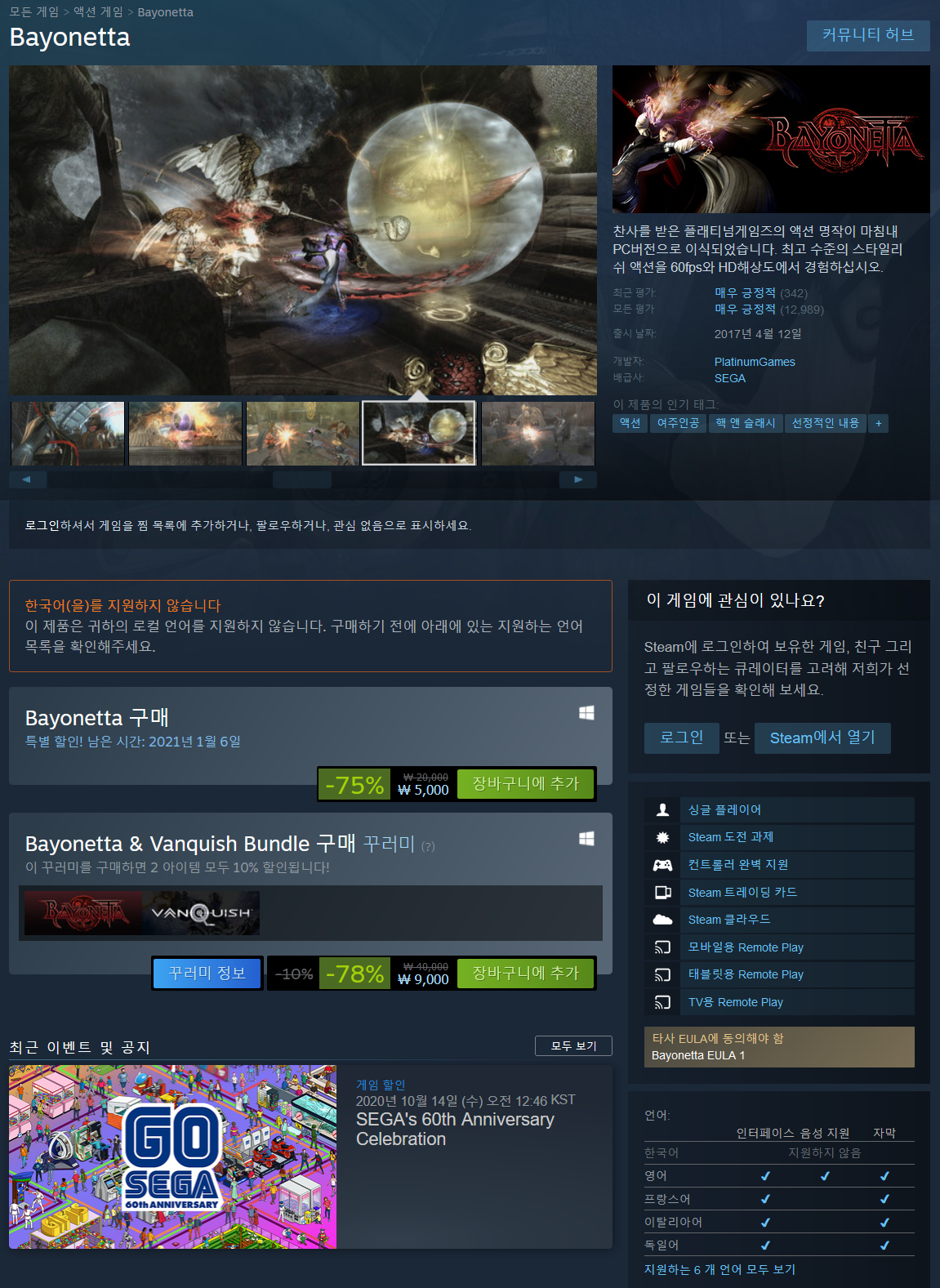 레지던트이블과 데빌메이크라이의 명성에 빛나는 플래티넘게임즈의 전설적인 디렉터 카미야 히데키와 세가가 칭송이 자자한 캐릭터 액션 게임을 PC로 이식하였습니다.
