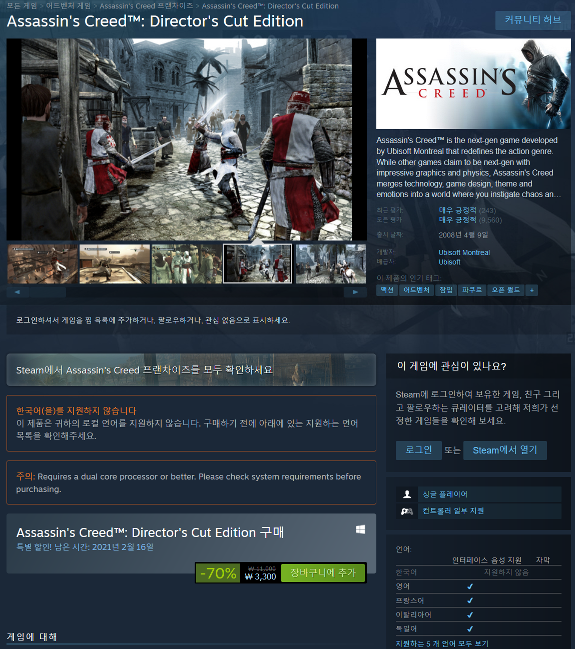 | 어쌔신크리드 2, Assassin's Creed 2 소개(Introduce),리뷰(Review),할인(Sale) 관련 (0) | 2021.02.14 |