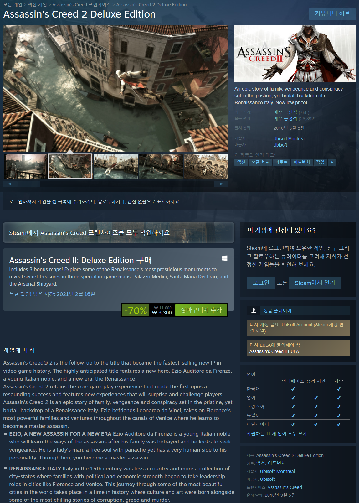 Assassin's Creed® 2는 비디오 게임 역사상 가장 빨리 팔린 새로운 IP가 된 타이틀의 후속작입니다. 매우 기대되는 타이틀은 새로운 영웅 Ezio Auditore da Firenze, 젊은 이탈리아 귀족과 새로운 시대, 르네상스를 특징으로 합니다.