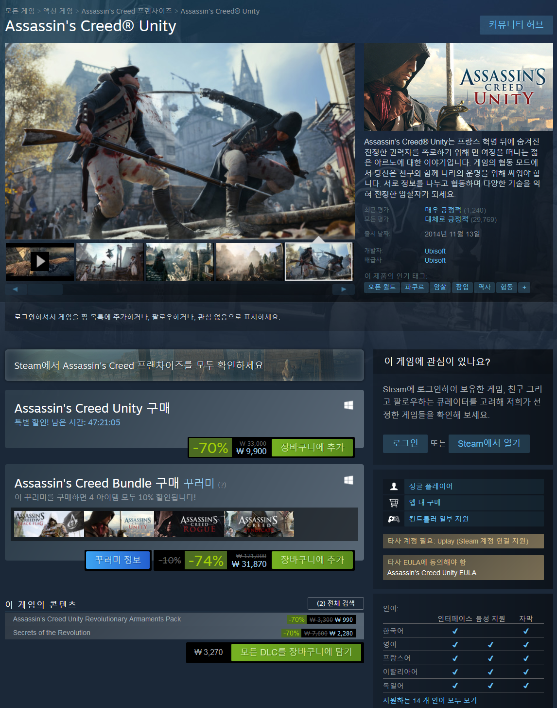 Assassin’s Creed® Unity는 프랑스 혁명이라는 어두운 시기의 파리에서 펼쳐지는 액션-어드벤처 게임입니다. 이번에는 나만의 영웅으로 플레이하게 됩니다. 외형과 기능 모두 사용자가 직접 설정한 장비로 아르노의 진정한 주인이 되세요. 싱글 플레이에 추가로 특정 미션의 온라인 협동 게임 플레이에서는 최대 3명의 친구와 함께 환상의 플레이를 경험할 수 있습니다. 게임 속에서 당신은 가장 중요한 프랑스 역사 중 한 장면과 흥미로운 스토리 라인을 경험할 수 있을 겁니다. 오늘날 빛의 도시로 불리는 아름다운 도시로 당신을 초대합니다.