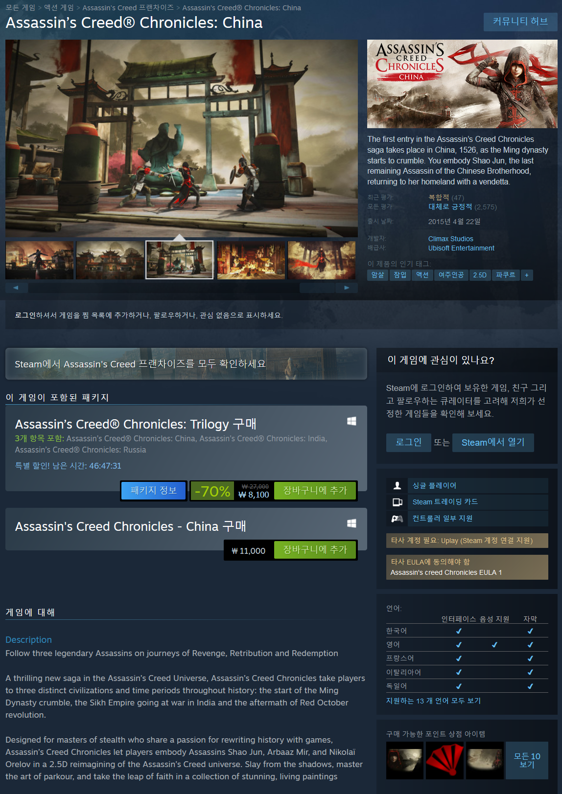 게임으로 역사를 다시 쓰는 것에 대한 열정을 공유하는 잠입 대가를 위해 설계된 Assassin's Creed Chronicles를 통해 플레이어는 Assassin's Creed 세계를 2.5D로 재해석한 Assassins Shao Jun, Arbaaz Mir 및 Nikolaï Orelov를 구현할 수 있습니다. 그림자를 물리치고, 파쿠르의 기술을 마스터하고, 놀랍고 살아있는 그림 컬렉션에서 믿음의 도약을 하십시오.