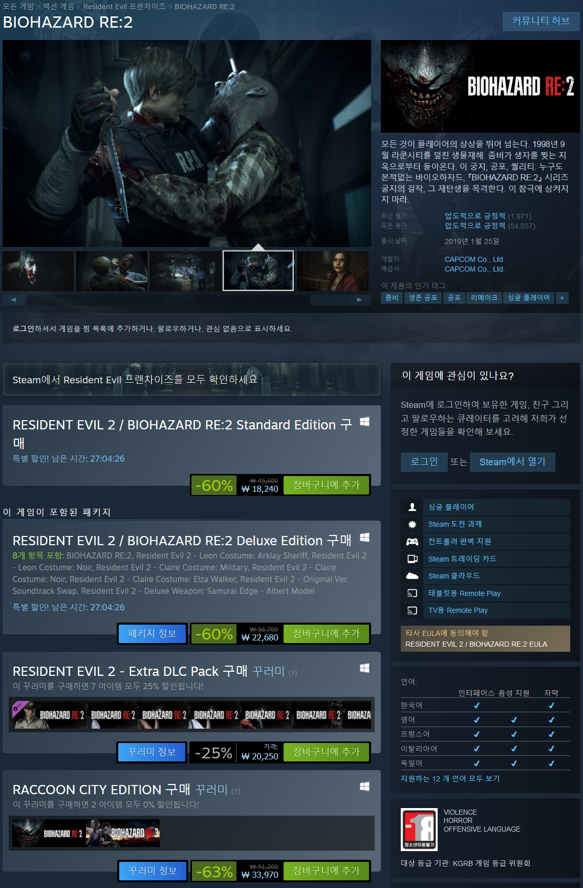 장르를 정의하는 걸작 레지던트 이블 2가 더 깊은 내러티브 경험을 위해 처음부터 완전히 재건되어 돌아옵니다. Capcom의 독점적인 RE 엔진을 사용하는 Resident Evil 2는 숨 막힐 정도로 사실적인 비주얼, 심장을 뛰게 하는 몰입형 오디오, 새로운 어깨에 메는 카메라, 오리지널의 게임 플레이 모드 위에 현대화된 컨트롤을 통해 고전적인 서바이벌 호러 사가를 새롭게 재해석합니다. 게임.