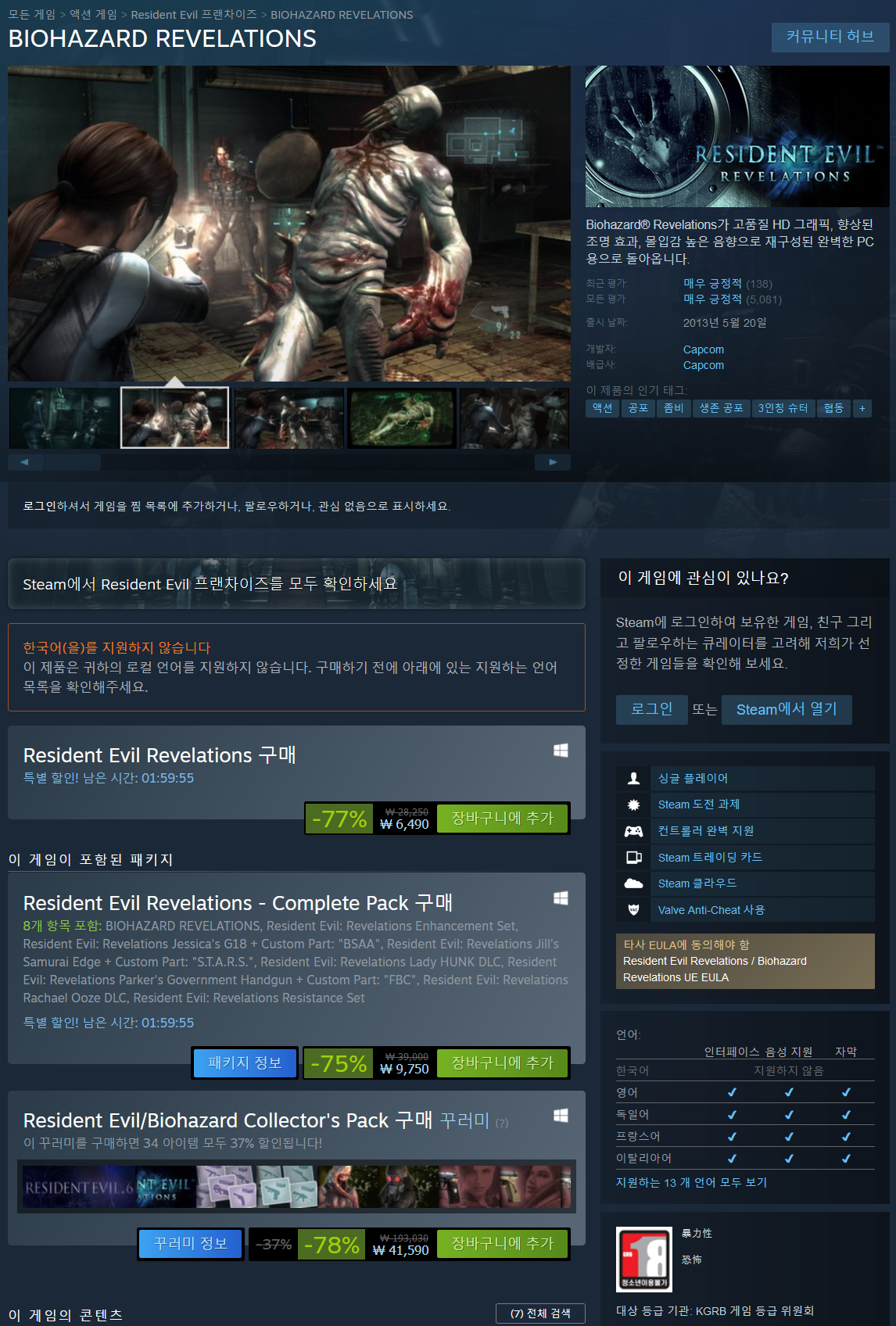 Biohazard® Revelations가 고품질 HD 그래픽, 향상된 조명 효과, 몰입감 높은 음향으로 재구성된 완벽한 PC용으로 돌아옵니다. 또한, 이 Biohazard Revelations 최신작은 무시무시한 새로운 적, 추가 난이도 모드, ResidentEvil.net과의 통합, 그리고 개선된 레이드 모드(Raid Mode)를 제공합니다. Biohazard Revelations 오리지널 시리즈에 처음 도입된 레이드 모드(Raid Mode)는 게이머가 온라인에서 협동 모드로 플레이하거나 싱글 플레이어에서 다양한 임무에서 등장하는 적의 무리를 상대하고, 캐릭터의 레벨을 올리고, 무기 업그레이드를 획득하며 혼자 플레이할 수도 있습니다. 신규 무기, 스킬 세트, 그리고 헝크를 포함한 플레이 가능한 캐릭터가 레이드 모드(Raid Mode) 경험을 새로운 깊이로 데려갑니다.