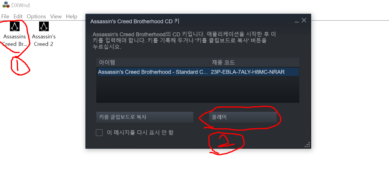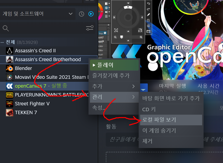 "그림1"에서 빨간 표시부분 처럼 라이브러리의 "어쌔신크리드 브라더후드"를 마우스 오른쪽 클릭후