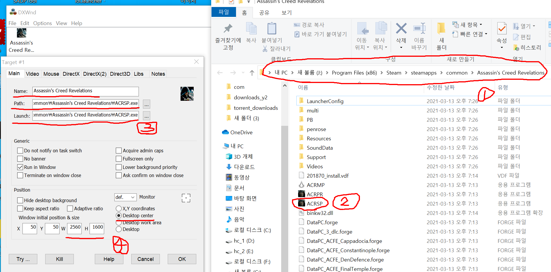 "ACRSP.exe"파일을 "그림2표시3"에서 "Path, Launch"에 그림처럼 설정해줍니다. 그리고 위에 "Name"부분에 적당히 이름을 아무거나 지어줍니다 그렇게하시면 일단 윈도우 창모드의 준비는 끝납니다. "그림2표시4" 부분에서 빨간부분표시 창모드크기(W,H)와 "Desktop center"은 입맛에 맞게 설정해주시면 됩니다.