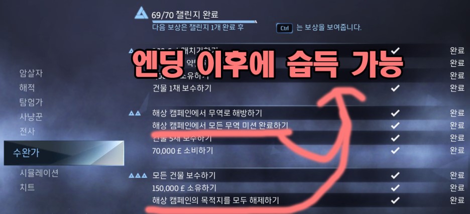 즉, 저 챌린지 1개를 제외한 모든 챌린지를 전부 완수 하여야 도전과제 올클이 가능합니다.