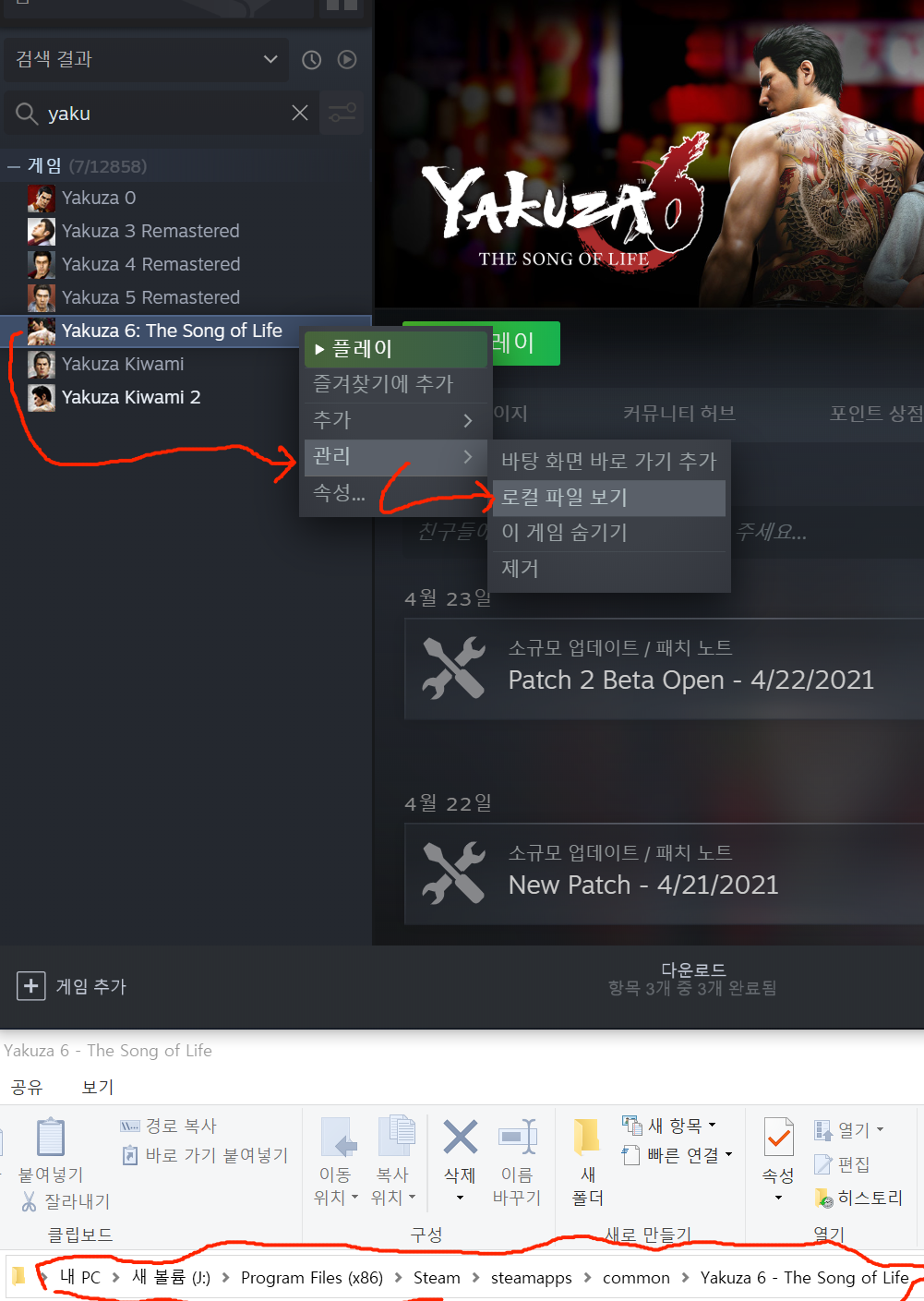 "그림1"에서 빨간 표시부분 처럼 라이브러리의 "Yakuza 6"를 마우스 오른쪽 클릭후 "관리->로컬파일보기"