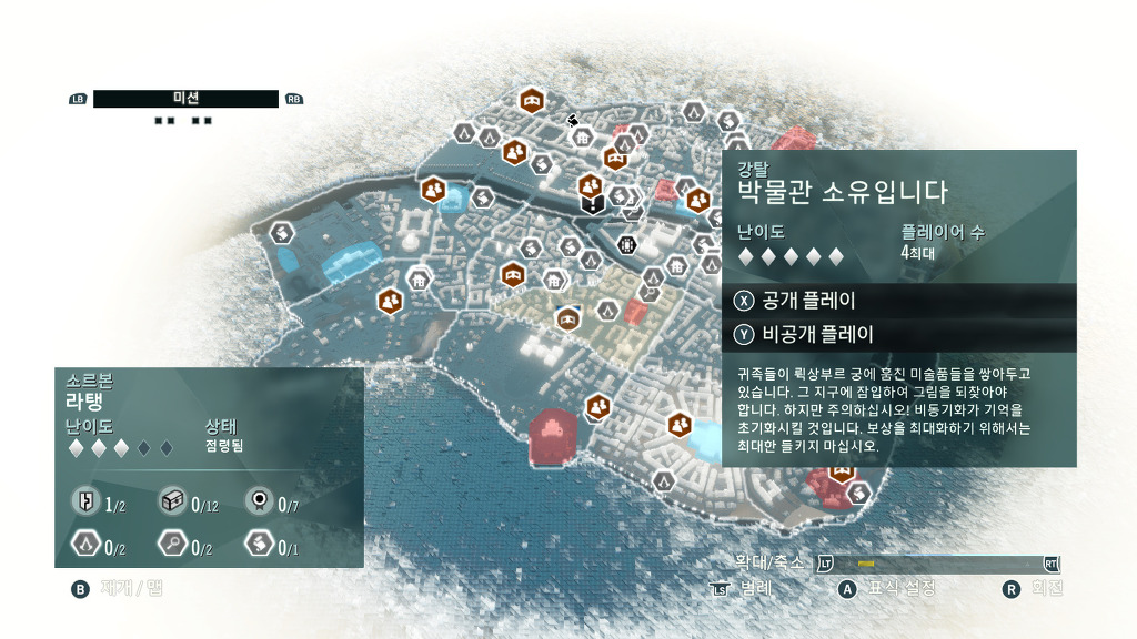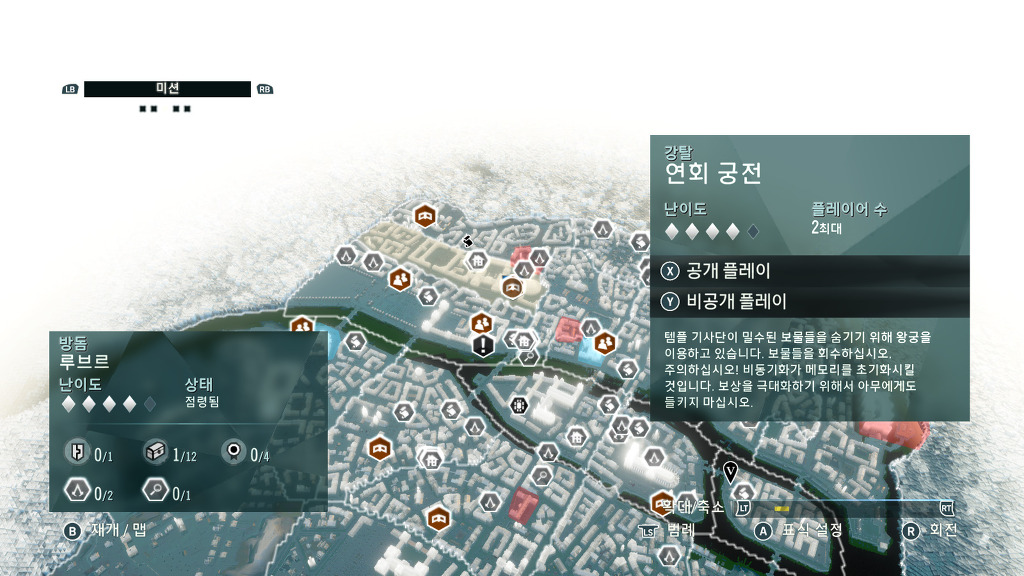 어쌔신크리드: 유니티에서는 여러가지 서브미션이 존재합니다. 일반미션에는 노스트라다무스의 수수께끼, 조사, 파리 이야기 등이 있고, 협동미션에는 강탈과 일반협동미션이 있습니다. 이 중에서 가장 보상을 두둑히 주는 미션은 강탈 미션이며, 강탈미션은 난이도에 따라 최대 7만에 가까운 돈을 획득할 수 있습니다. 강탈 미션은 기본적으로 "적에게 발각되지 않고 미션 수행"이 원칙입니다. 적에게 발각되어 적의 머리 위에 붉은 느낌표가 생겼다면, 가변 보상이 줄어들기 시작합니다.