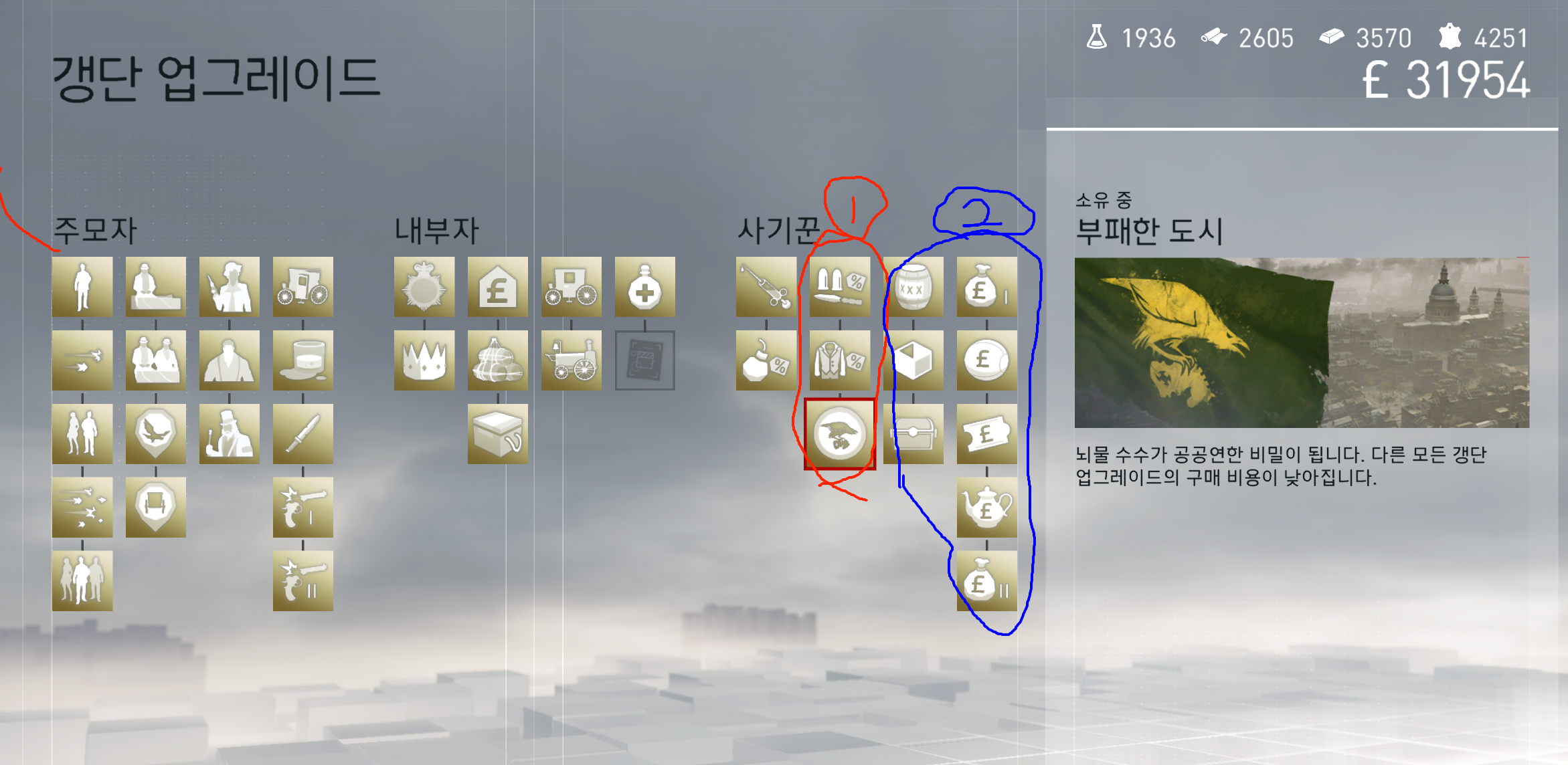 그림1) 과 같이 "그림표시1"의 "부패한 도시"까지 끝까지 업그레이드 해주면 "갱단 업그레이드"의 업그레이드 가격들이