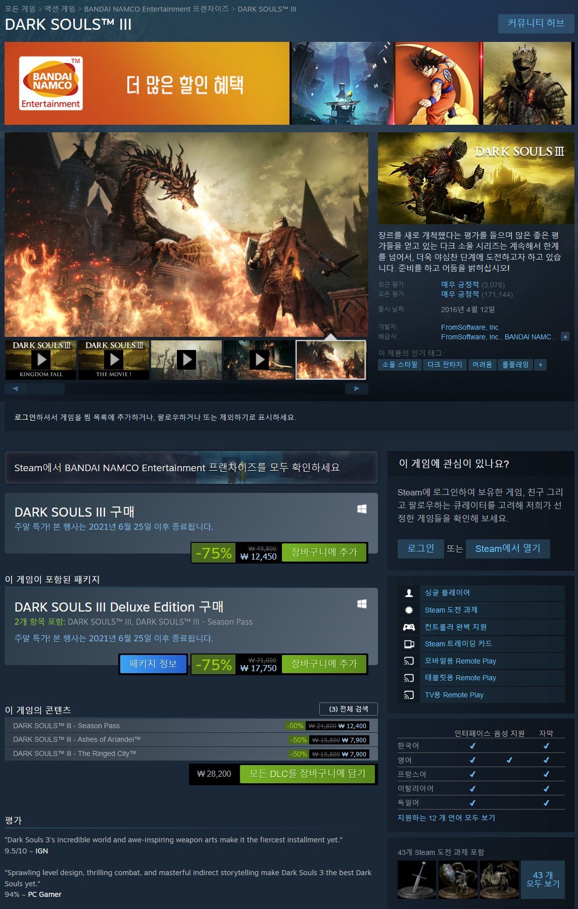 - DARK SOULS III 75% (12,450원 최저가)