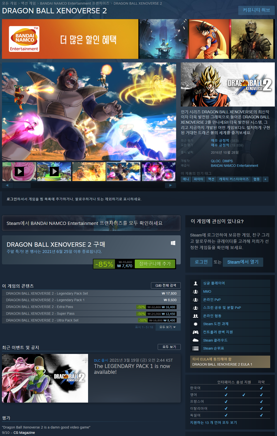 인기 시리즈 DRAGON BALL XENOVERSE의 최신작이자 더욱 발전된 그래픽으로 돌아온 DRAGON BALL XENOVERSE 2를 만나세요! 더욱 발전된 시스템, 그리고 지금까지 개발된 어떤 게임보다도 철저하게 구현된 거대한 드래곤 볼의 세계를 즐겨보세요.