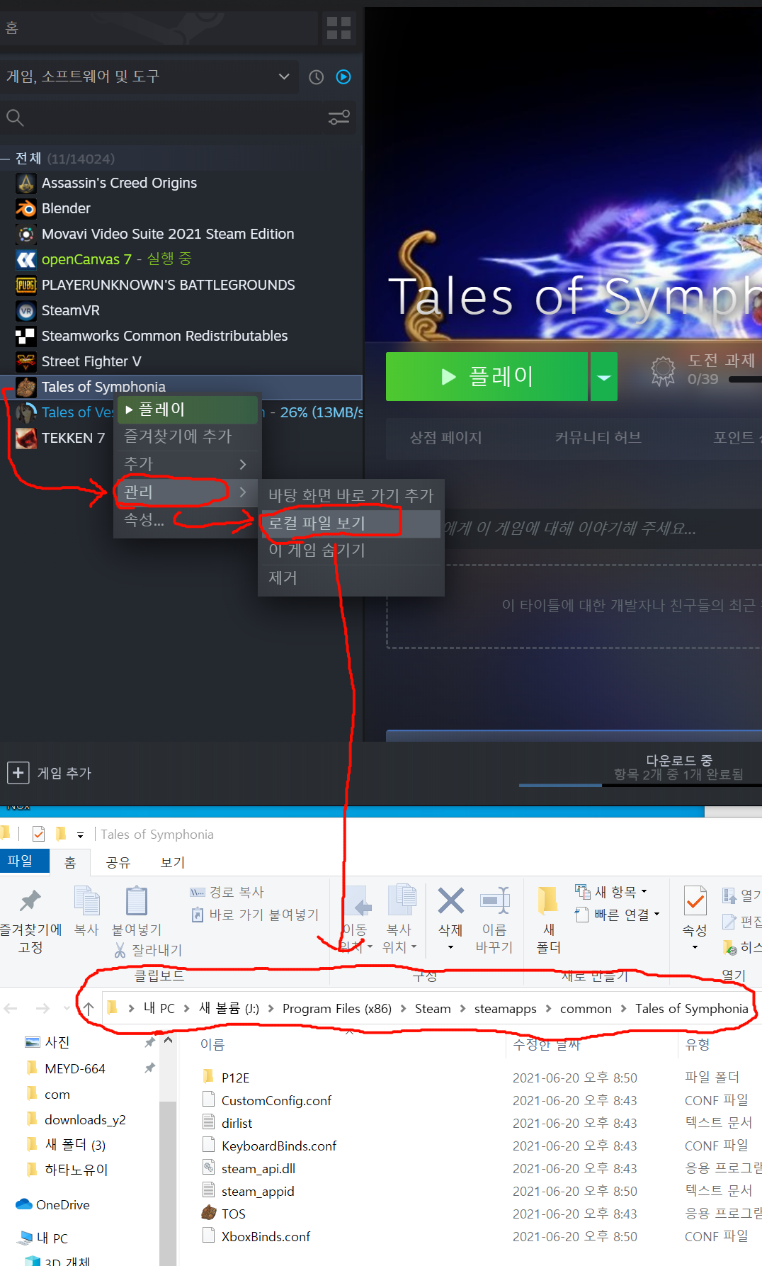 오른쪽 클릭후 "관리->로컬 파일 보기" 를 눌러주면 해당 설치된 폴더가 나옵니다.