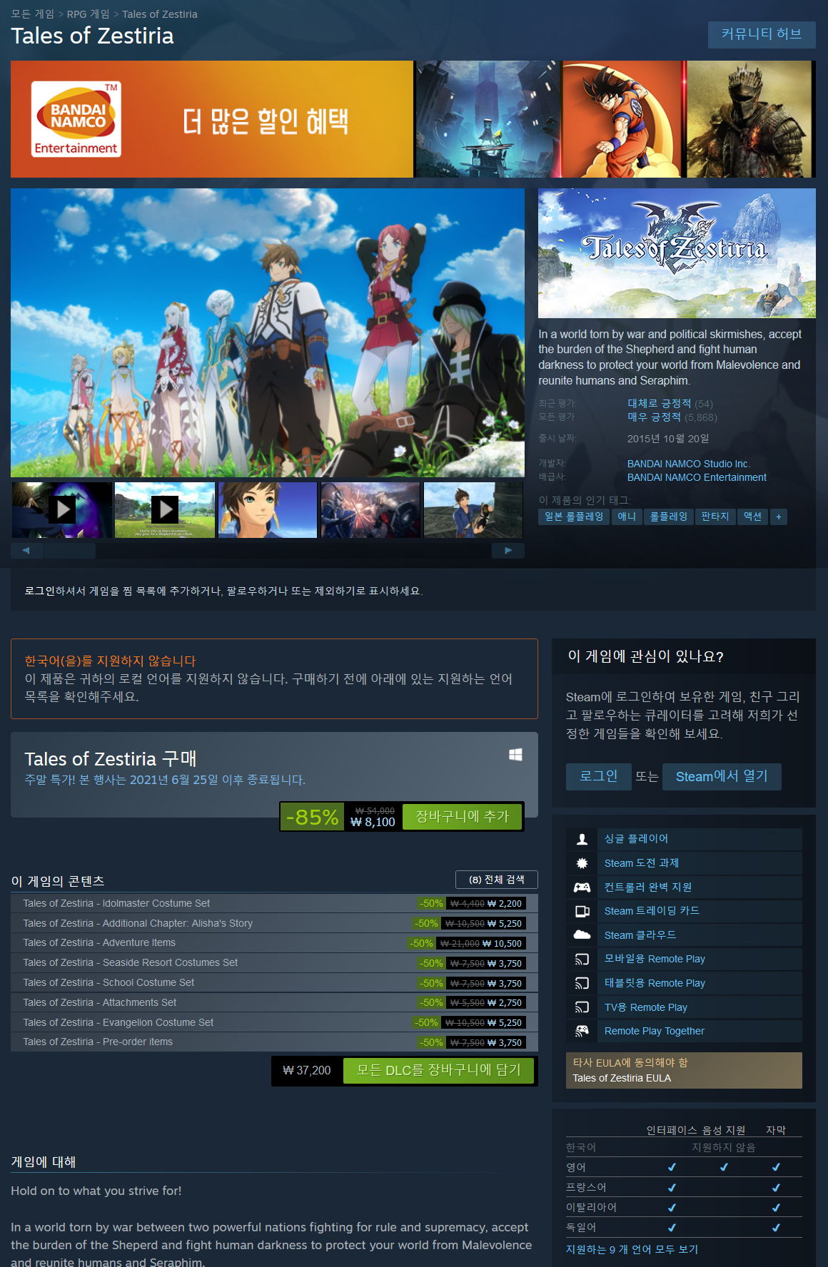 테일즈 오브 시리즈 20주년 기념작이자 첫 스팀 출시작..인데