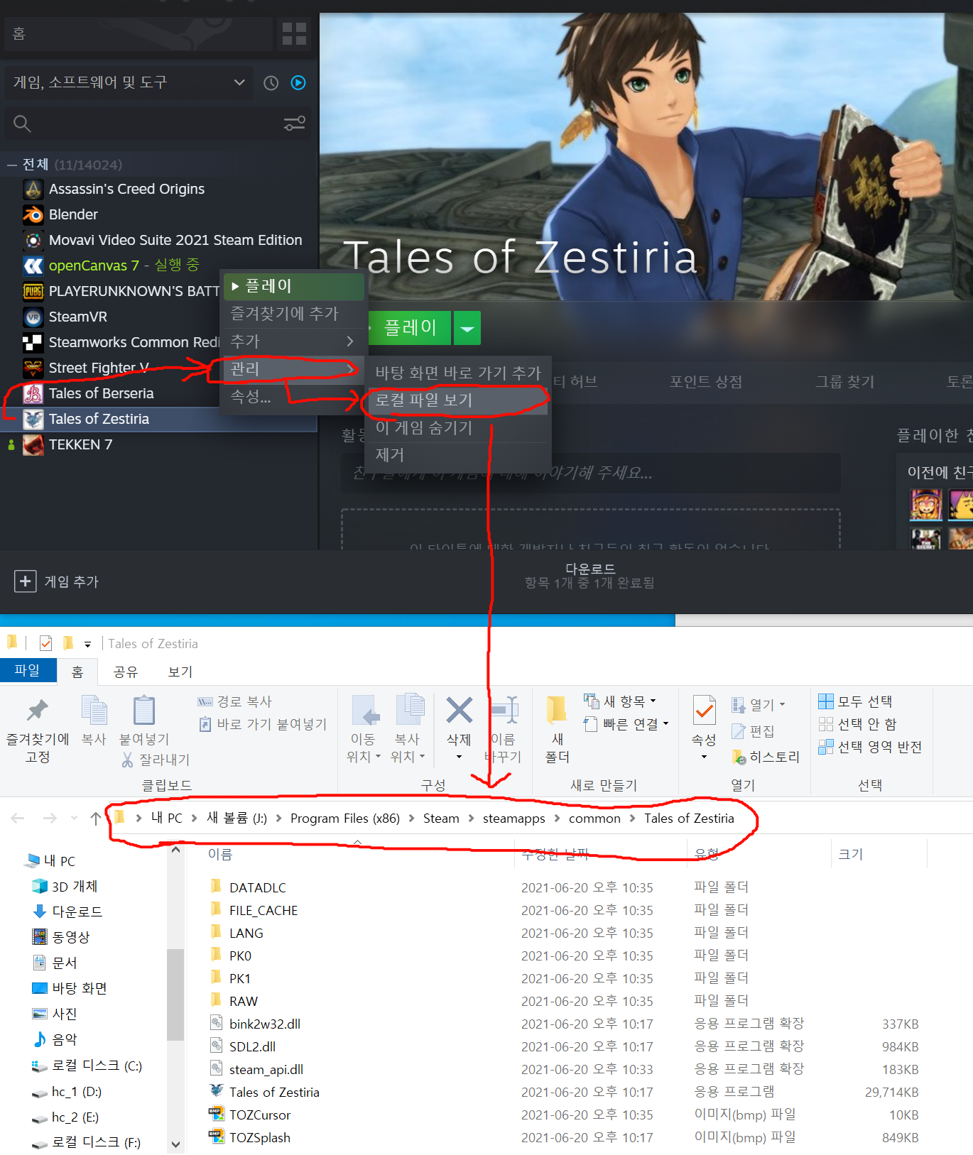 2) 그 다음 콘텐츠 폴더를 여세요. (스팀 라이브러리 - Tales of Zestiria 우클릭 - 속성 - 로컬 파일 - 로컬 콘텐츠 폴더 보기 클릭)
