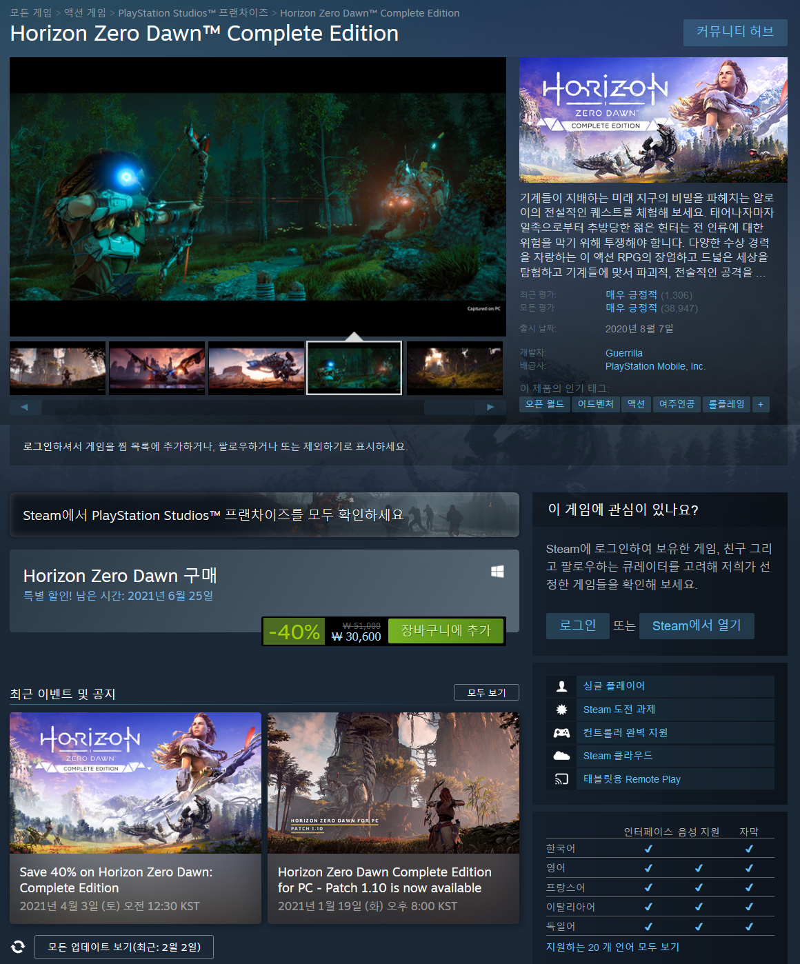 호라이즌 제로 던™은 다양한 상을 수상한 액션 롤플레잉 게임으로, 이번 PC용 컴플리트 에디션에는 새로운 대지와 스킬, 무기 및 기계 등이 등장하는 대규모 확장판 “얼어붙은 오지”가 포함됩니다.