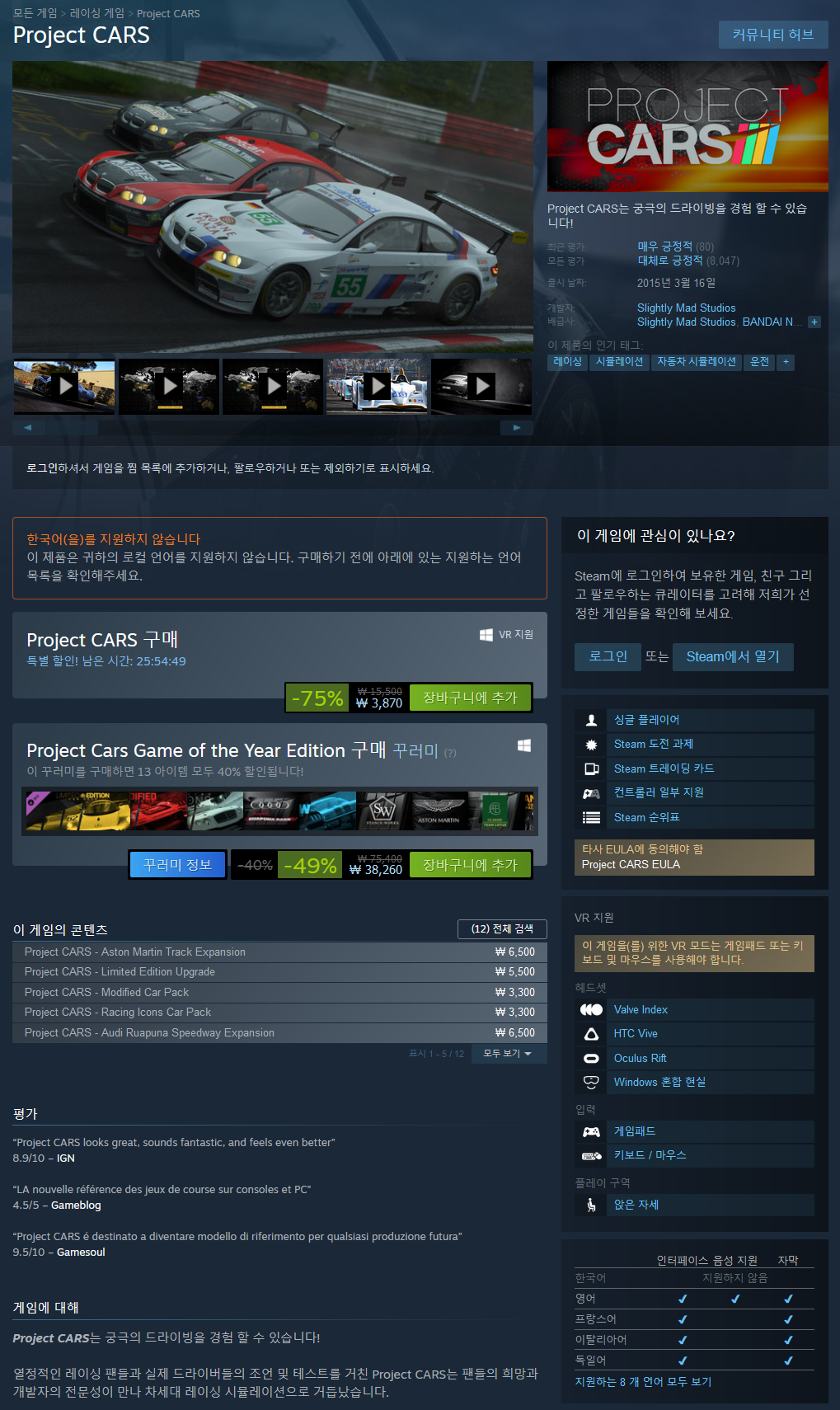 최근 레이싱 게임들 중 가장 많은 트랙 로스터를 제공하며, 획기적인 낮 과 밤, 날씨 변화 시스템, 심도 있는 튜닝과 피트 스탑, 그리고 Oculus Rift와 12K Ultra HD 해상도를 통해 Project CARS는 다른 경쟁작들보다 앞서 나갑니다.