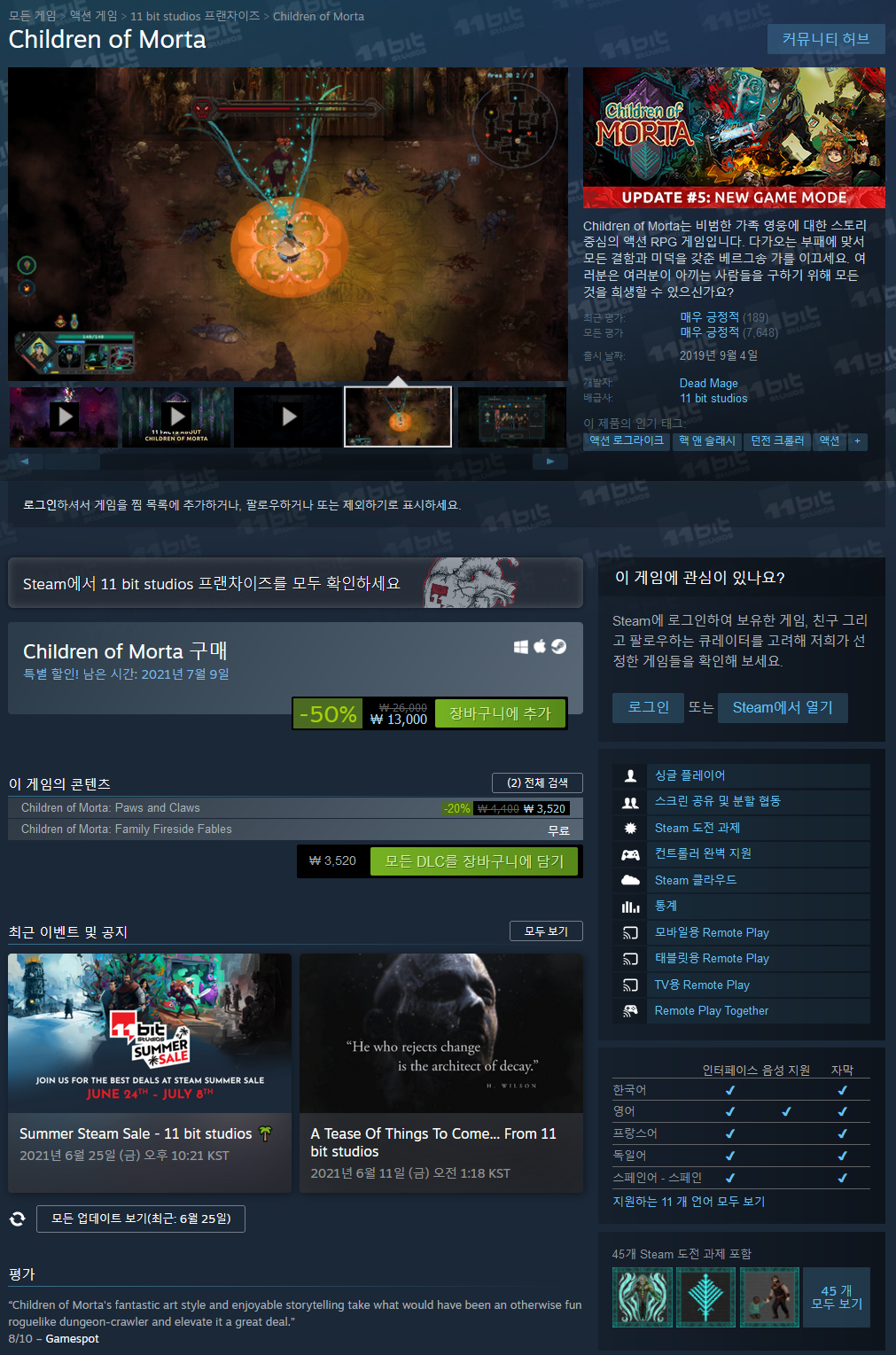 또한 스팀의 리모트 플레이 투게더(Remote Play Together) 기능도 사용하실 수 있습니다. 로컬 멀티플레이어 게임을 Steam 친구와 함께 온라인으로 즐길 수 있으며, 게임이 기본적으로 온라인 플레이를 지원하지 않더라도 협동이 가능합니다. 자세한 정보를 확인해보세요 HERE.