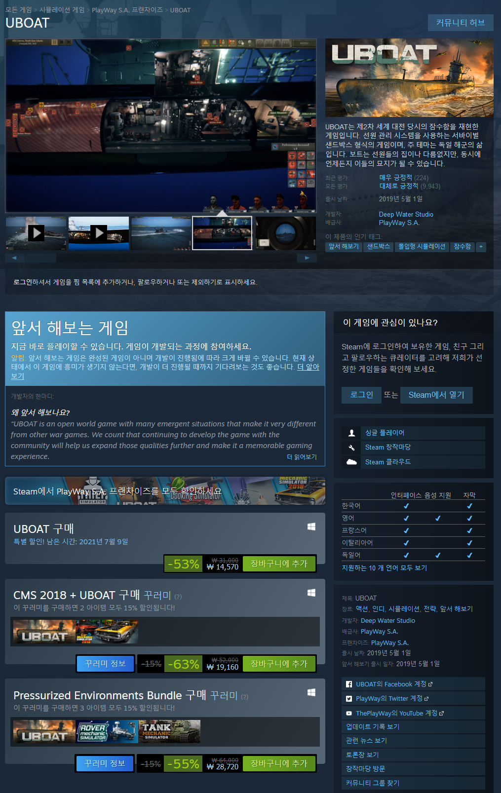 게임의 시뮬레이션 요소는 매우 현실적이면서도 게임 플레이를 전혀 훼손하지 않습니다. 뛰어난 시뮬레이션 요소에도 불구하고 UBOAT는 일반 게임과 같이 플레이하실 수 있으며, 까다로운 문제는 배를 지휘하는 더 훌륭한 선장이 되기를 원할 때 배워도 늦지 않습니다.