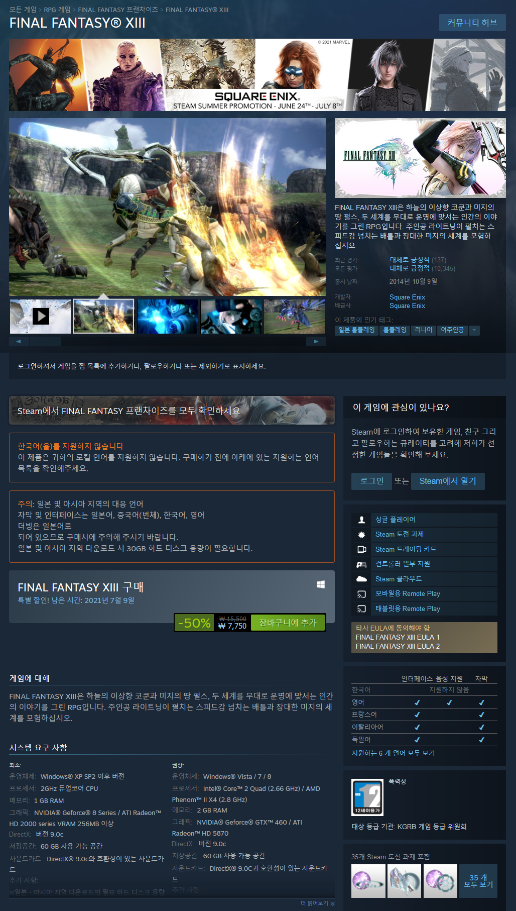 잊을 수 없는 스토리 라인, 액션과 전략이 결합된 전투 시스템, 최첨단 비주얼, 경외심을 불러일으키는 영화 시퀀스를 특징으로 하는 FINAL FANTASY® XIII는 게임 진화의 다음 단계를 제공합니다.