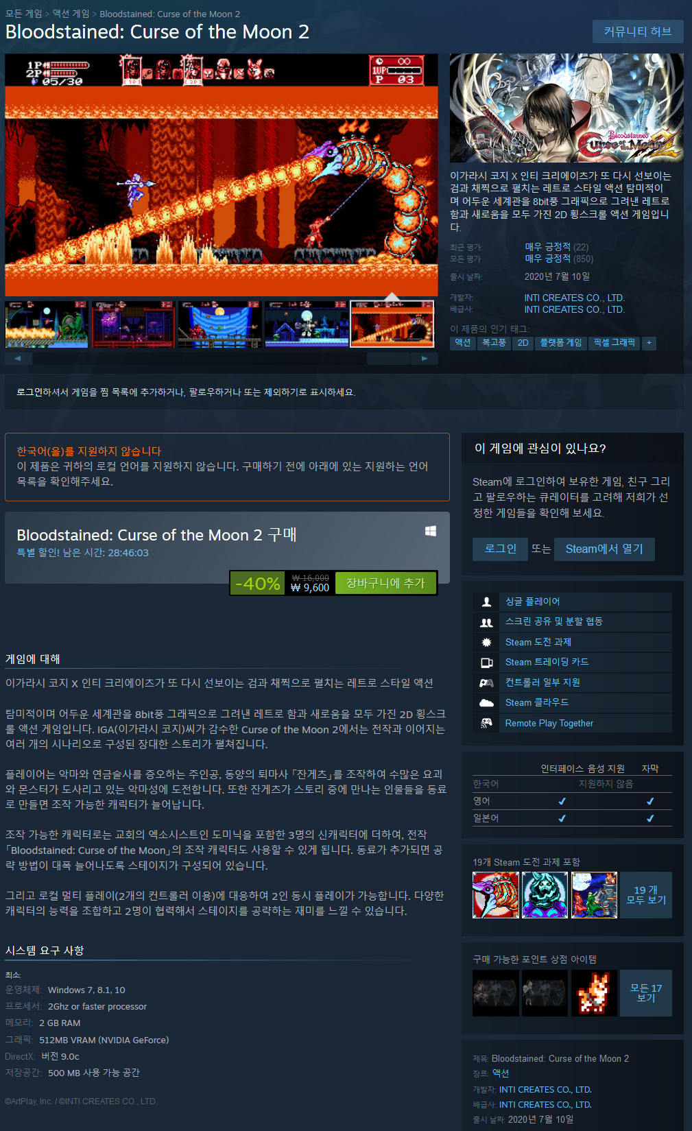 탐미적이며 어두운 세계관을 8bit풍 그래픽으로 그려낸 레트로 함과 새로움을 모두 가진 2D 횡스크롤 액션 게임입니다. IGA(이가라시 코지)씨가 감수한 Curse of the Moon 2에서는 전작과 이어지는 여러 개의 시나리오로 구성된 장대한 스토리가 펼쳐집니다.