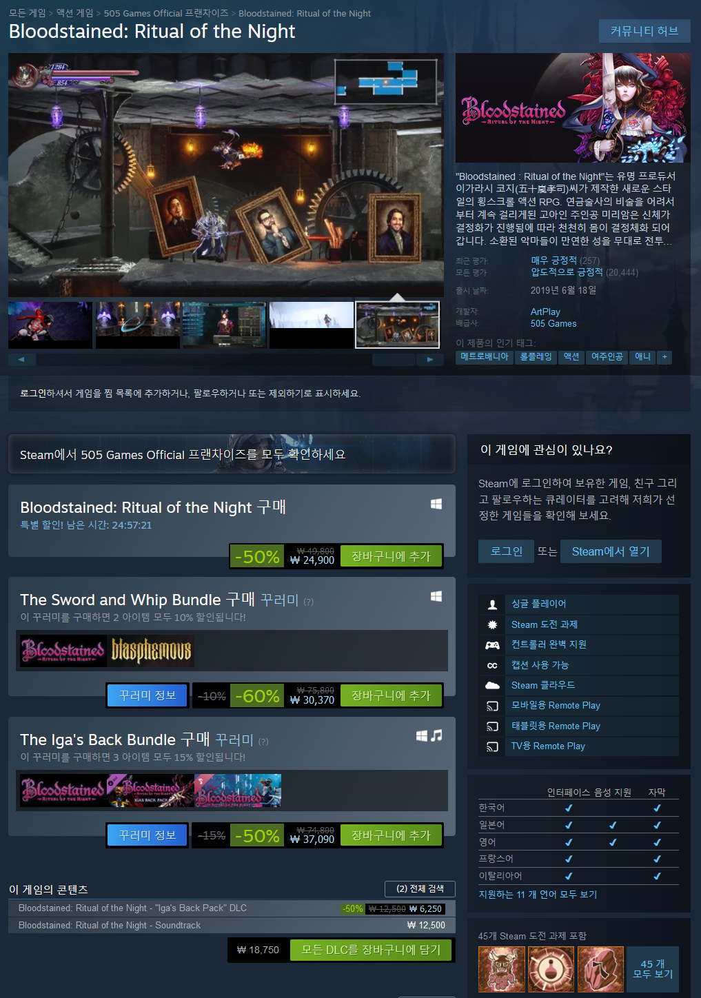 Bloodstained : Ritual of the Night는 최고의 게임 경험입니다 본작은 Metroidvania (메트로이드 바니아) 장르로 널리 알려진 최고의 콘텐츠를 하나의 게임에 담은 탐색형 횡스크롤 액션 RPG입니다.
