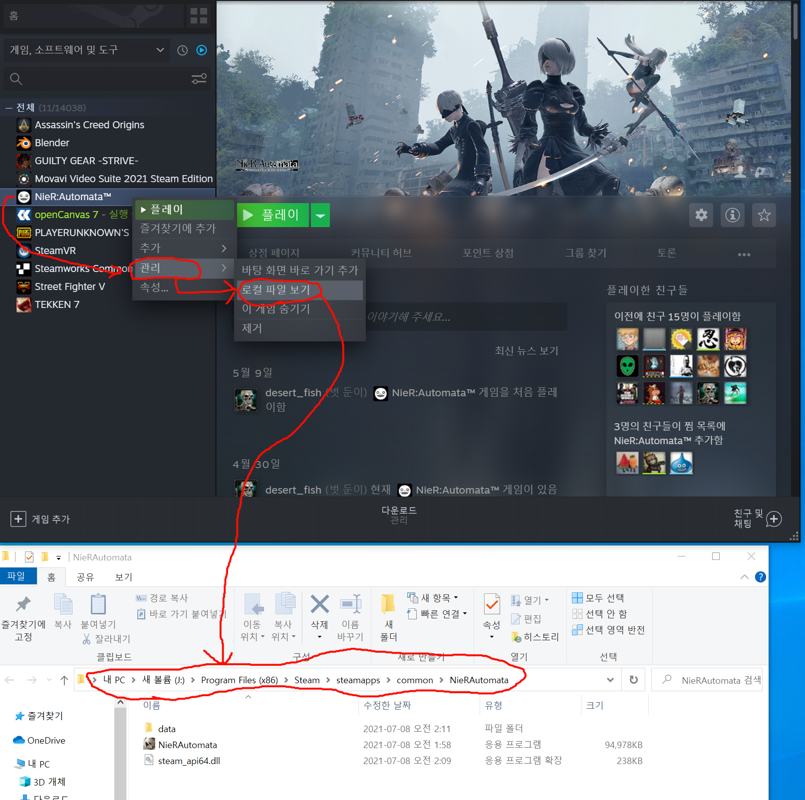 오른쪽 클릭후 "관리->로컬 파일 보기" 를 눌러주면 해당 설치된 폴더가 나옵니다.