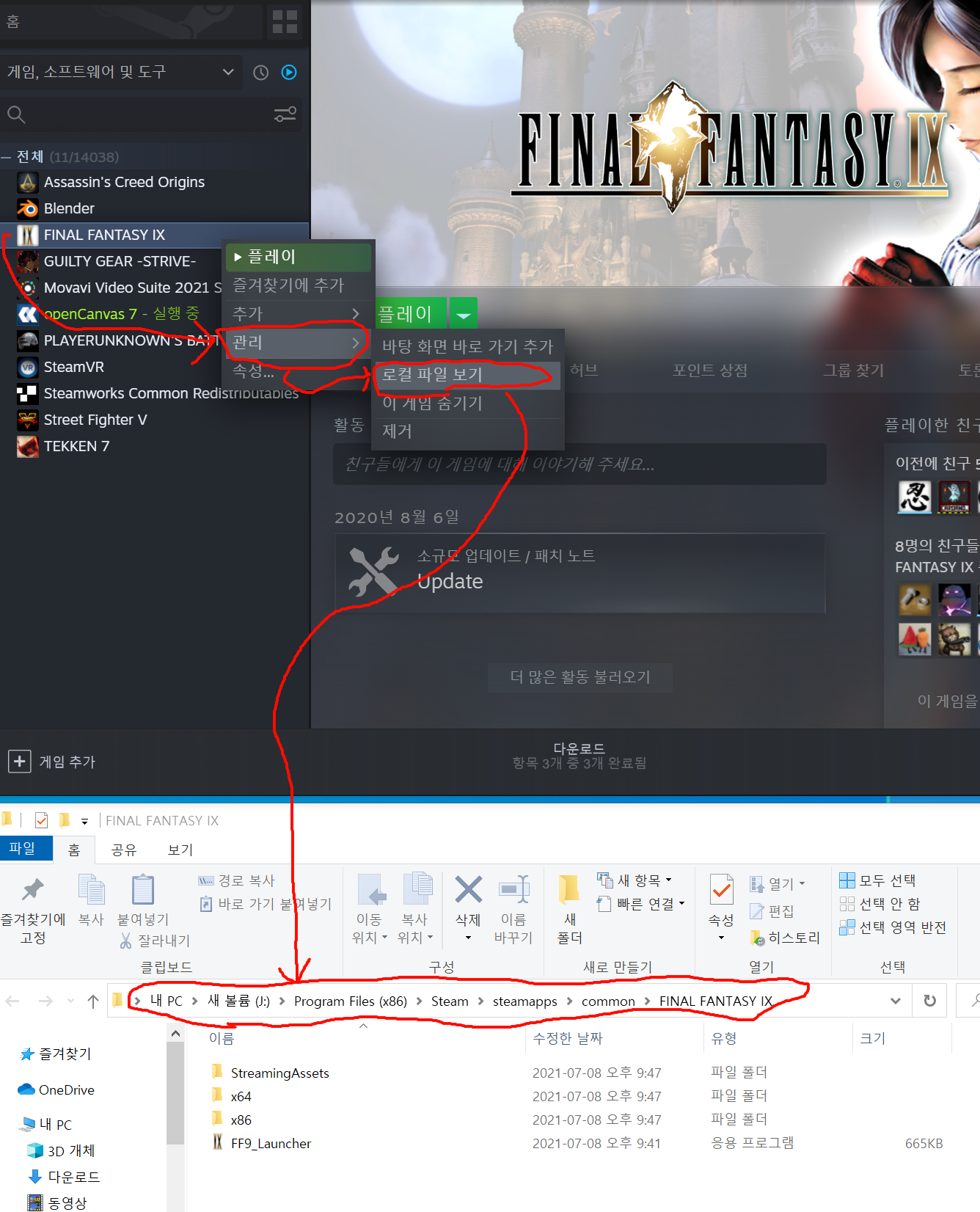 오른쪽 클릭후 "관리->로컬 파일 보기" 를 눌러주면 해당 설치된 폴더가 나옵니다.