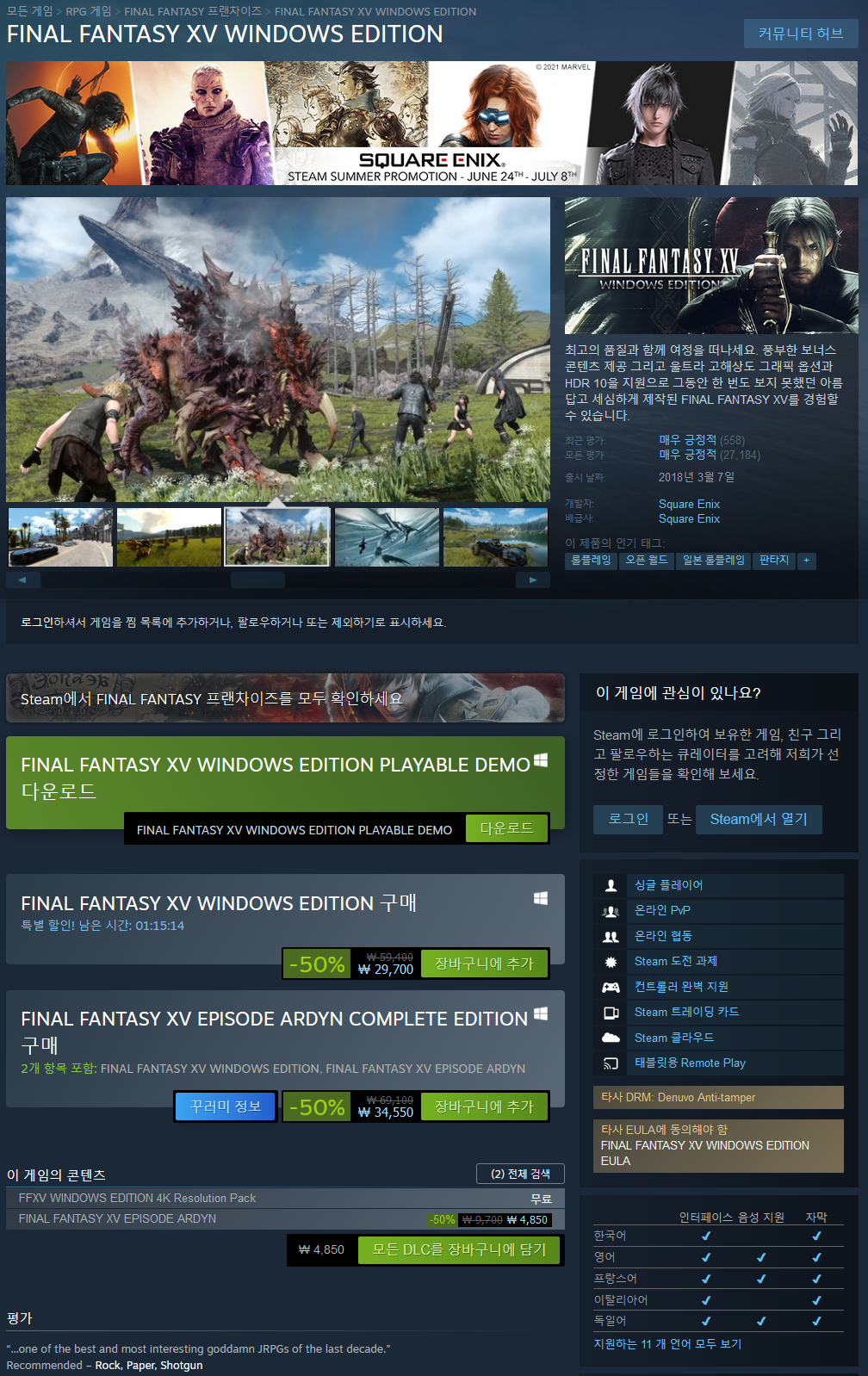 고해상도 디스플레이, HDR10 등 Windows PC용 최첨단 기술이 새로 도입되어, FINAL FANTASY XV의 아름답고 섬세한 게임 플레이 경험은 그 어느 때보다 확장될 것입니다.