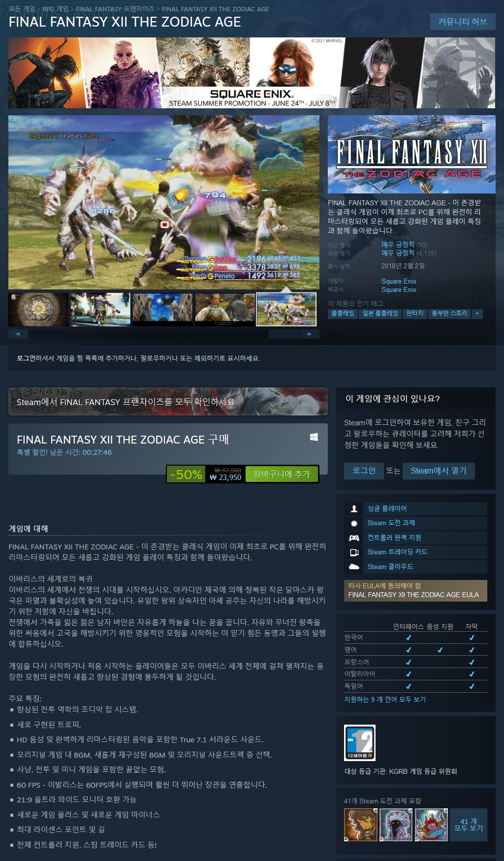 FINAL FANTASY XII THE ZODIAC AGE - 이 존경받는 클래식 게임이 이제 최초로 PC를 위해 완전히 리마스터링되어 모든 새롭고 강화된 게임 플레이 특징과 함께 돌아왔습니다.