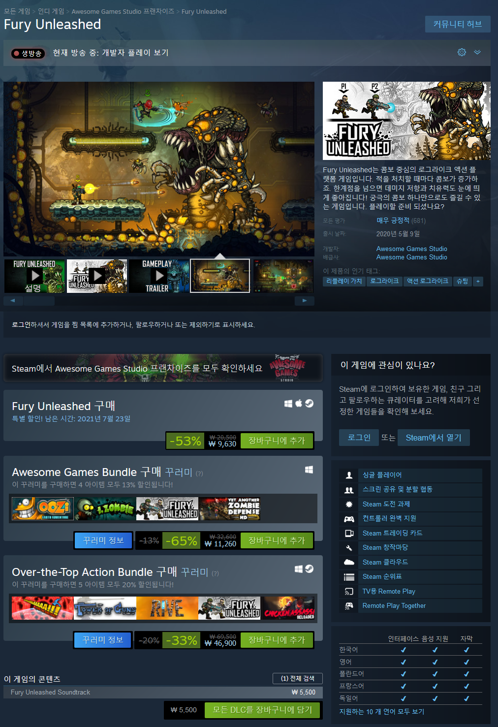 FURY Unleashed는 데드셀, 로그 레거시와 같은 모던 로그라이크 플랫폼 게임과 향수를 불러일으키는 콘트라, 메탈 슬러그 등의 올드 스쿨 플랫폼 게임의 재미를 모두 느낄 수 있는 게임입니다. 5년간의 노력을 통해 위에 언급한 게임들 만큼 기억에 남는 플레이 경험을 만들어냈고, 게이머 여러분이 절대 실망하지 않을 것이라고 확신합니다.