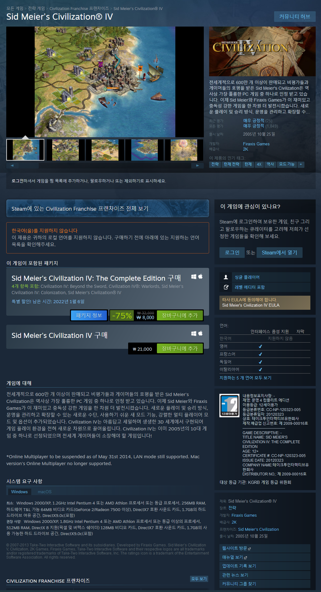 전세계적으로 600만 개 이상이 판매되고 비평가들과 게이머들의 호평을 받은 Sid Meier's Civilization은 역사상 가장 훌륭한 PC 게임 중 하나로 인정 받고 있습니다. 이제 Sid Meier와 Firaxis Games가 이 재미있고 중독성 강한 게임을 한 차원 더 발전시켰습니다. 새로운 플레이 및 승리 방식, 문명을 관리하고 확장할 수 있는 새로운 수단, 사용하기 쉬운 새 모드 기능, 강렬한 멀티 플레이어 모드 및 옵션이 추가되었습니다. Civilization IV는 아름답고 세밀하며 생생한 3D 세계에서 구현되어 게임 플레이 환경을 전혀 새로운 차원으로 끌어올립니다. Civilization IV는 이미 2005년의 10대 게임 중 하나로 선정되었으며 전세계 게이머들이 소장해야 할 게임입니다!